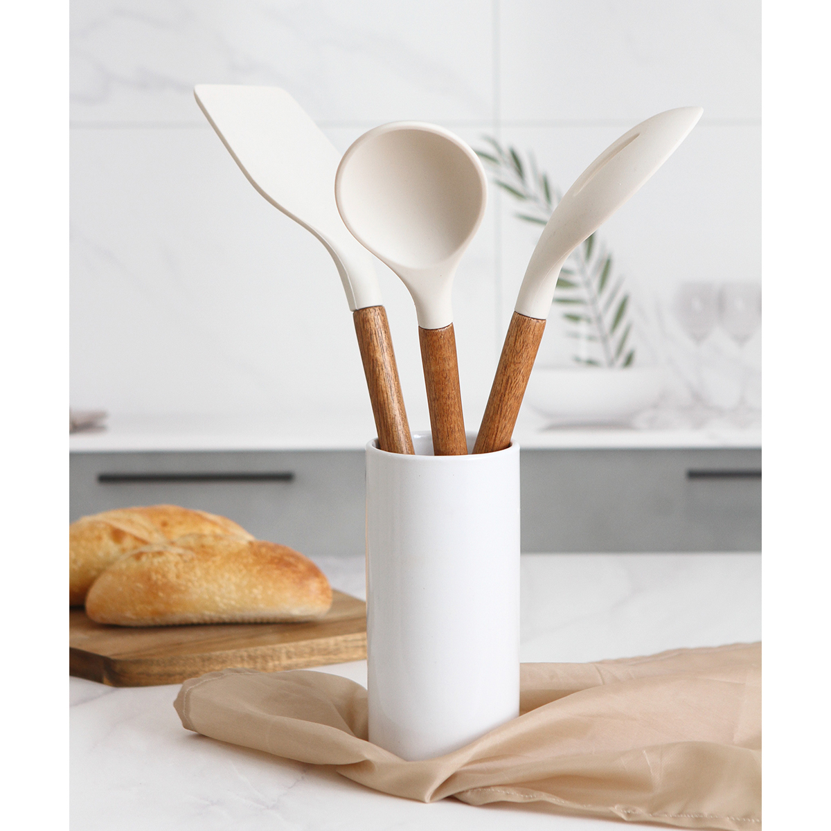 Juego Lulea. - Juego de utensilios de cocina, fabricados en madera de acacia y silicón, contiene dos cucharas y una espátula. Incluye base de cerámica blanca.