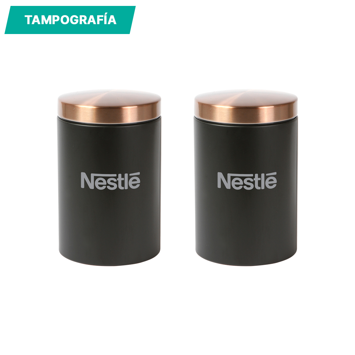 Set Skive. - Set de dos frascos fabricados en acero laminado en frío, incluye tapa de acero 410 SS con recubrimiento de cobre. Capacidad de 1,300 ml.