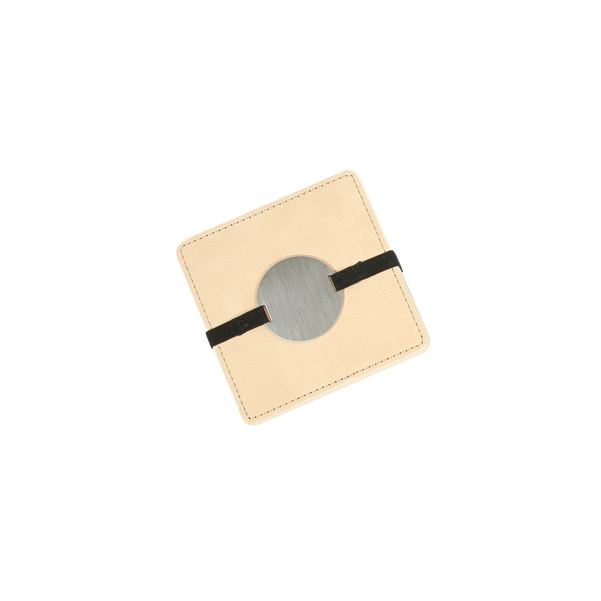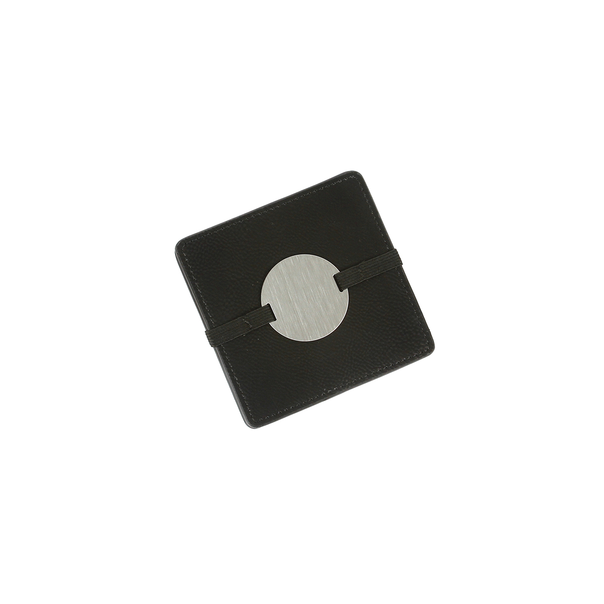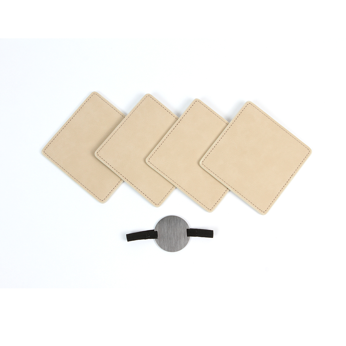 Juego de porta vasos Toffen. - Juego de 4 piezas de porta vasos fabricado en curpiel, forma cuadrada, prácticos y elegantes, fáciles de limpiar y de guardar, ya que cuentan con una banda elástica con una placa de metal circular. Accesorios funcionales que ayudan a mantener el orden y evitar derrames en diversas superficies como escritorios, mesas o muebles del hogar. Ofrecen soporte estable para tazas, botellas y vasos, protegiendo contra manchas, humedad y ralladuras. Además, aportan un toque decorativo y práctico al espacio, siendo ideales tanto para el hogar como para oficinas.