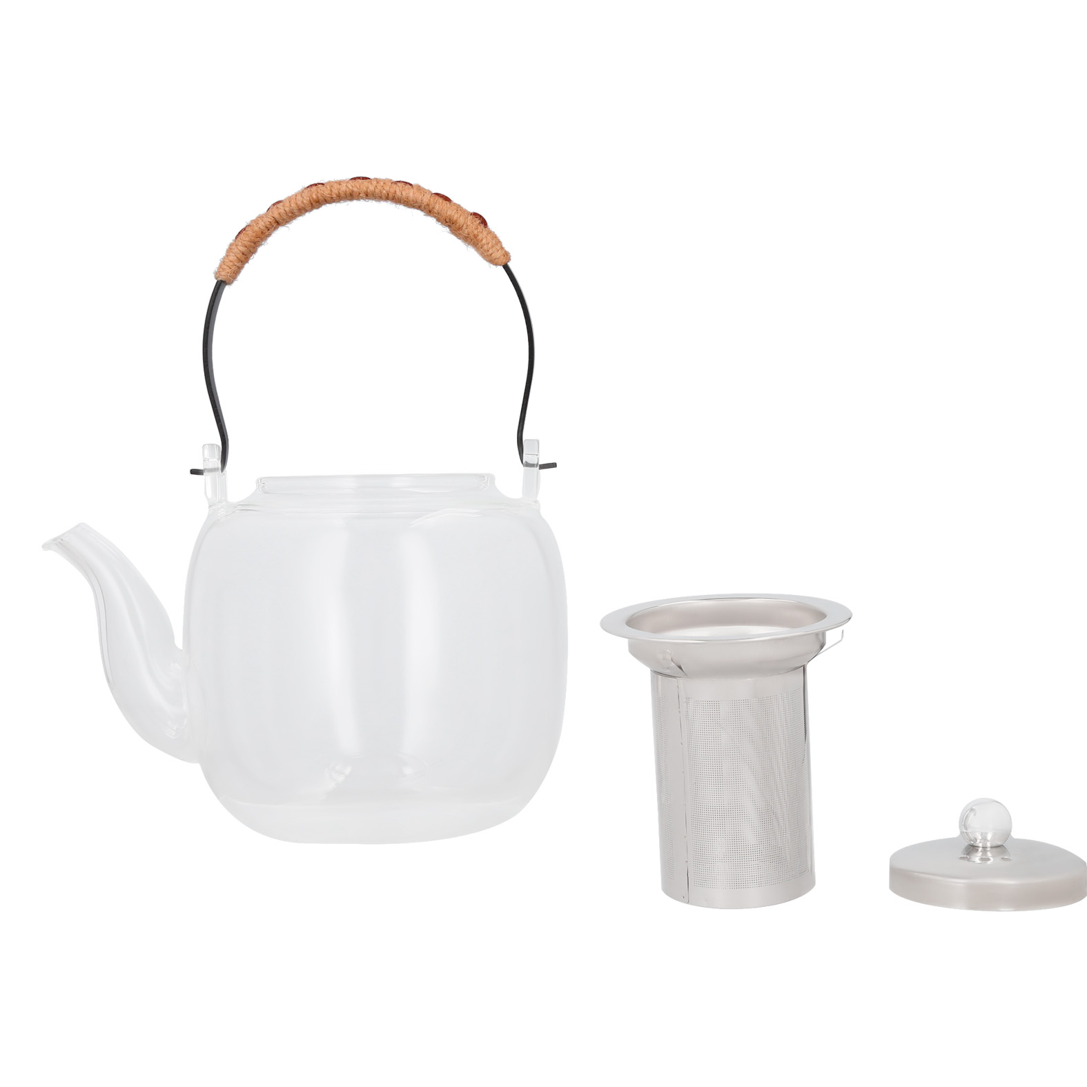 BALL Tetera de vidrio con infusor de acero inoxidable, tapa y asa metalica recubierta con cuerda.