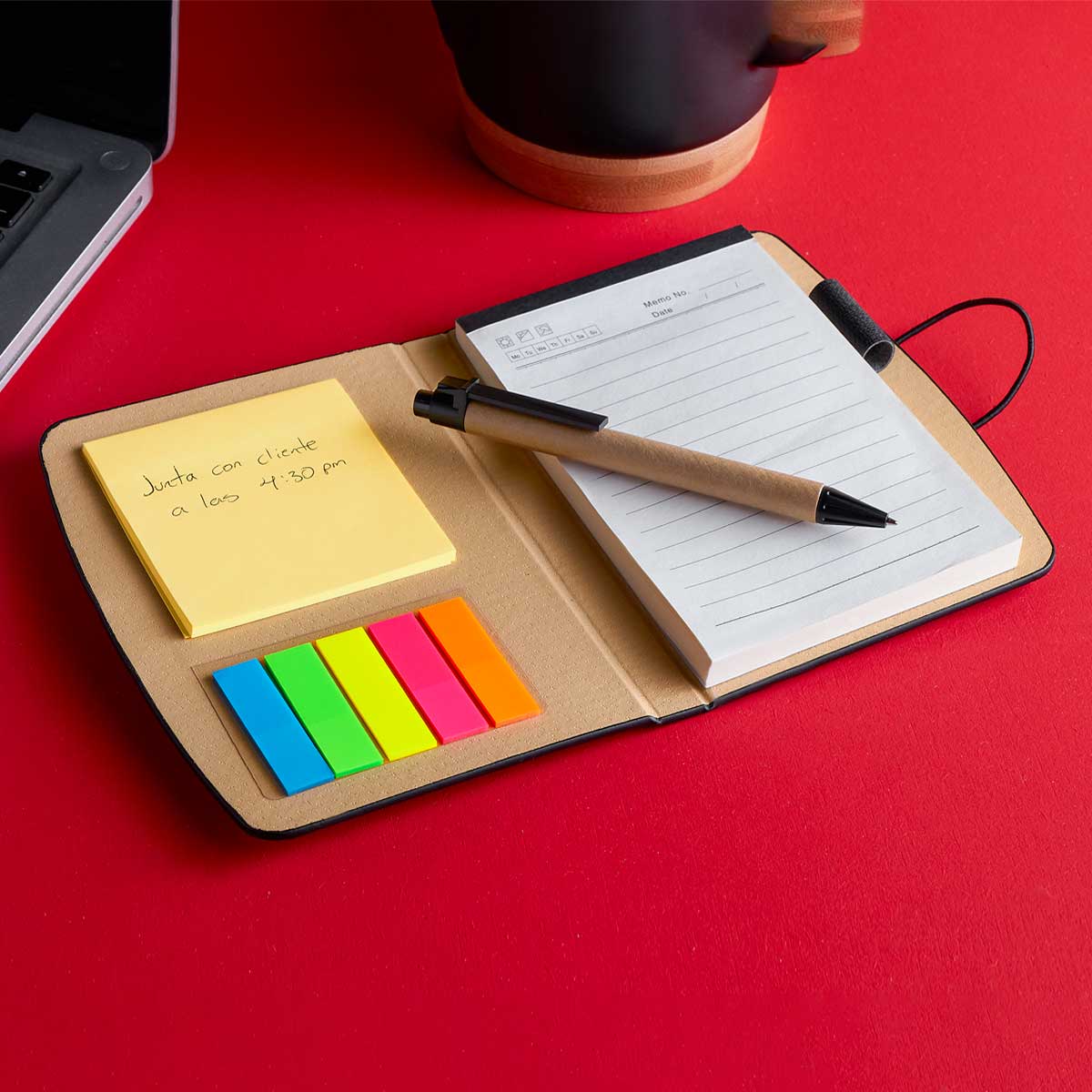 LIBRETA OWAMI - Libreta con 70 hojas de raya. Incluye elástico para cerrar, bolígrafo ecológico, notas amarillas y banderillas adheribles de diferentes colores.
