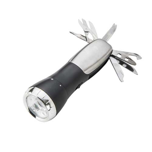 LORETTO Lámpara de cinco LEDS con flash y navaja de 8 funciones: destapador, navaja 2 sierras, desarmador, tijeras y lima, utiliza tres baterías AAA ya incluidas.