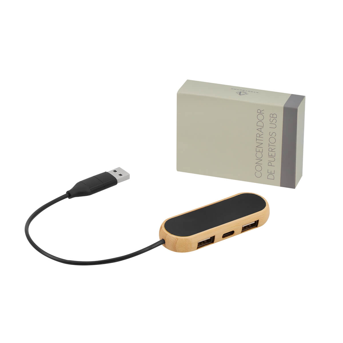 CONCENTRADOR DE PUERTOS TALLIN - Concentrador con 2 puertos USB 2.0 y 1 puerto tipo C. Soporta transferencia de datos. Cable de conexión con USB y tipo C. El bambú es un producto natural el cual puede presentar variaciones en tonalidades y vetas.