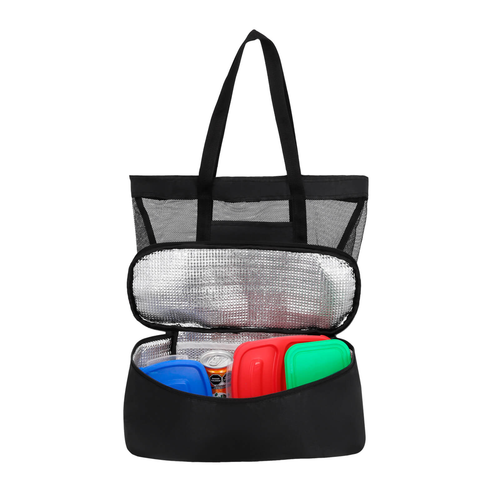 KATU Bolsa de red con 1 compartimento principal, 1 bolsa frontal y lonchera metalizada con cierre en la parte inferior, cuenta con 2 asas superiores.