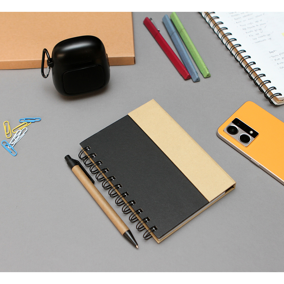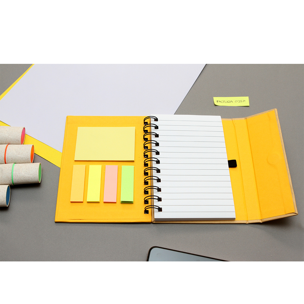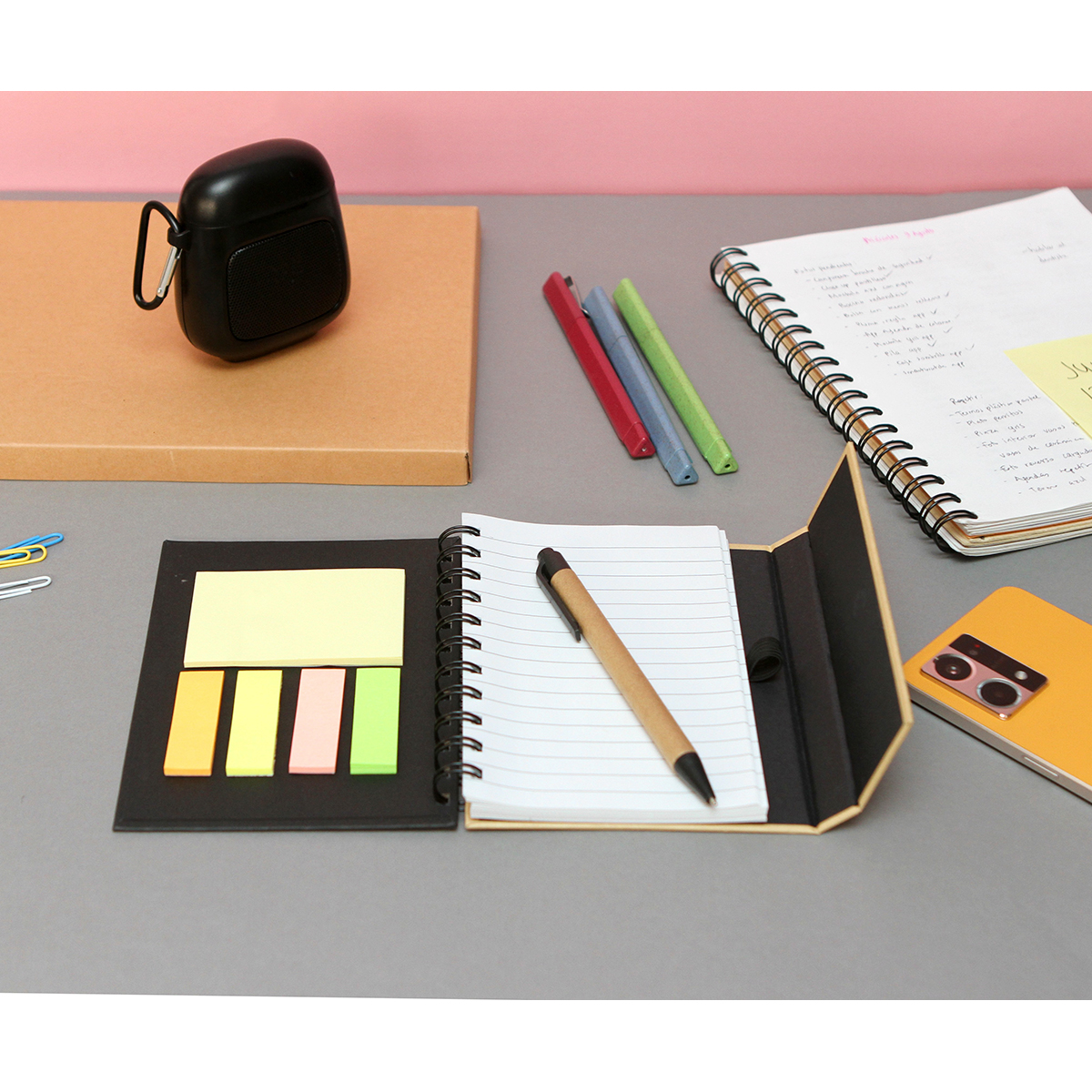 Libreta ecológica Génova. - Libreta ecológica bi-tono con 60 hojas de raya, bolígrafo tinta negra, 25 notas adhesivas y banderitas de colores (100 en 4 colores). Con un tamaño compacto A6, la libreta Génova es fácil de transportar.