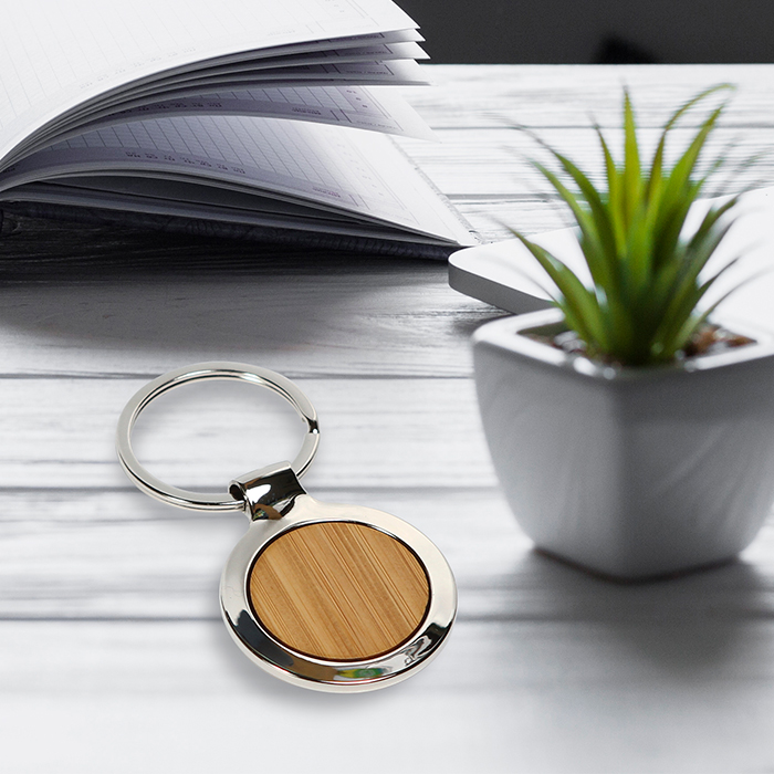Llavero de bambú Ennis. - Llavero redondo con placa de bambú y detalles niquelados.