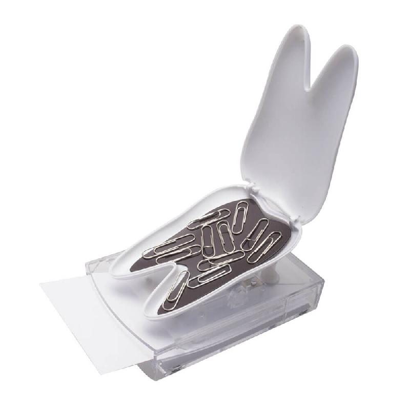 Dispensador de notas y porta clips en forma de muela. Medidas: 11 x 6.5 x 8 cm Material: Plástico.