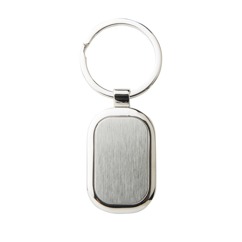 ZEUS Llavero con placa metálica central, esquinas redondeadas y aro reforzado.