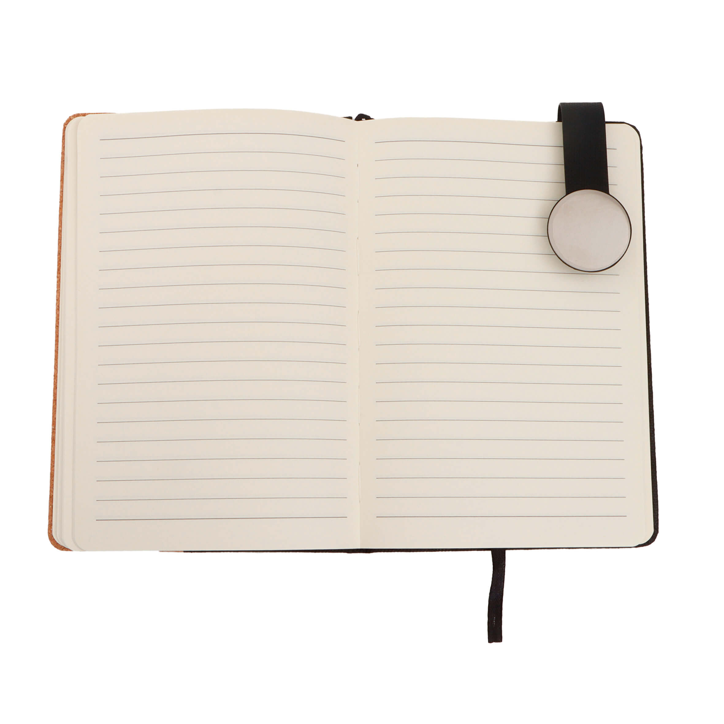 ALDER Libreta de poliuretano con detalle de corcho y broche magnético con placa circular que contiene 98 hojas rayadas y separador.