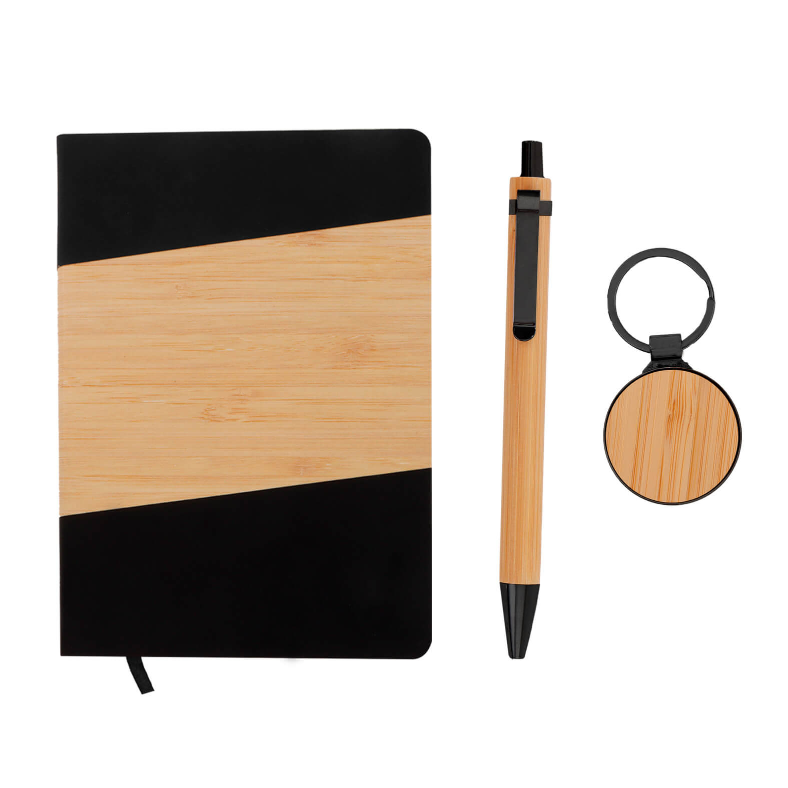 ZANE Set ejecutivo incluye: llavero metálico con detalle en bambú, bolígrafo de bambú, libreta y caja de regalo.