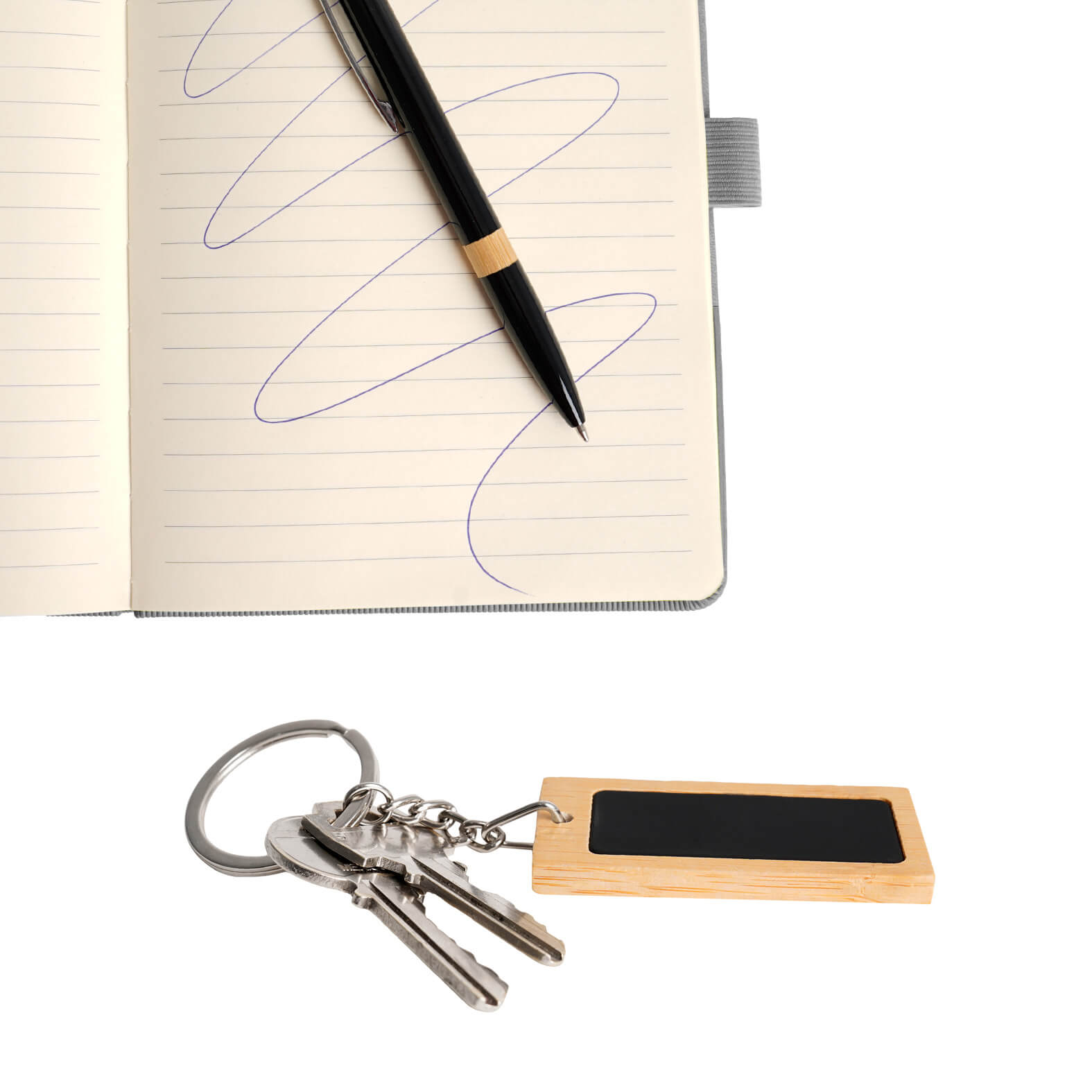 BURS Set de bolígrafo con llavero que incluye: bolígrafo con detalles de bambú, clip metálico y mecanismo de clic, además de llavero de bambú con aro reforzado.