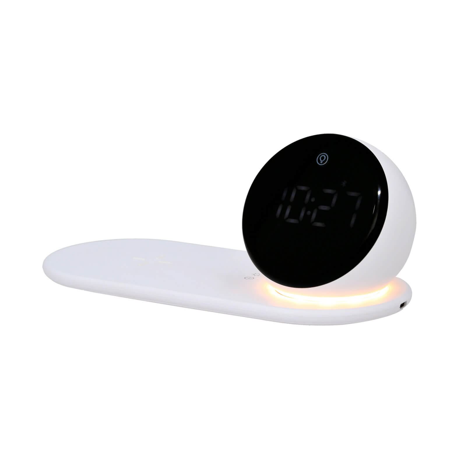 WEC Cargador inalámbrico con alarma digital, bluetooth, bocina y lámpara de noche con tres modalidades. Incluye cable de carga tipo C. (Compatible con dispositivos con tecnología Qi).