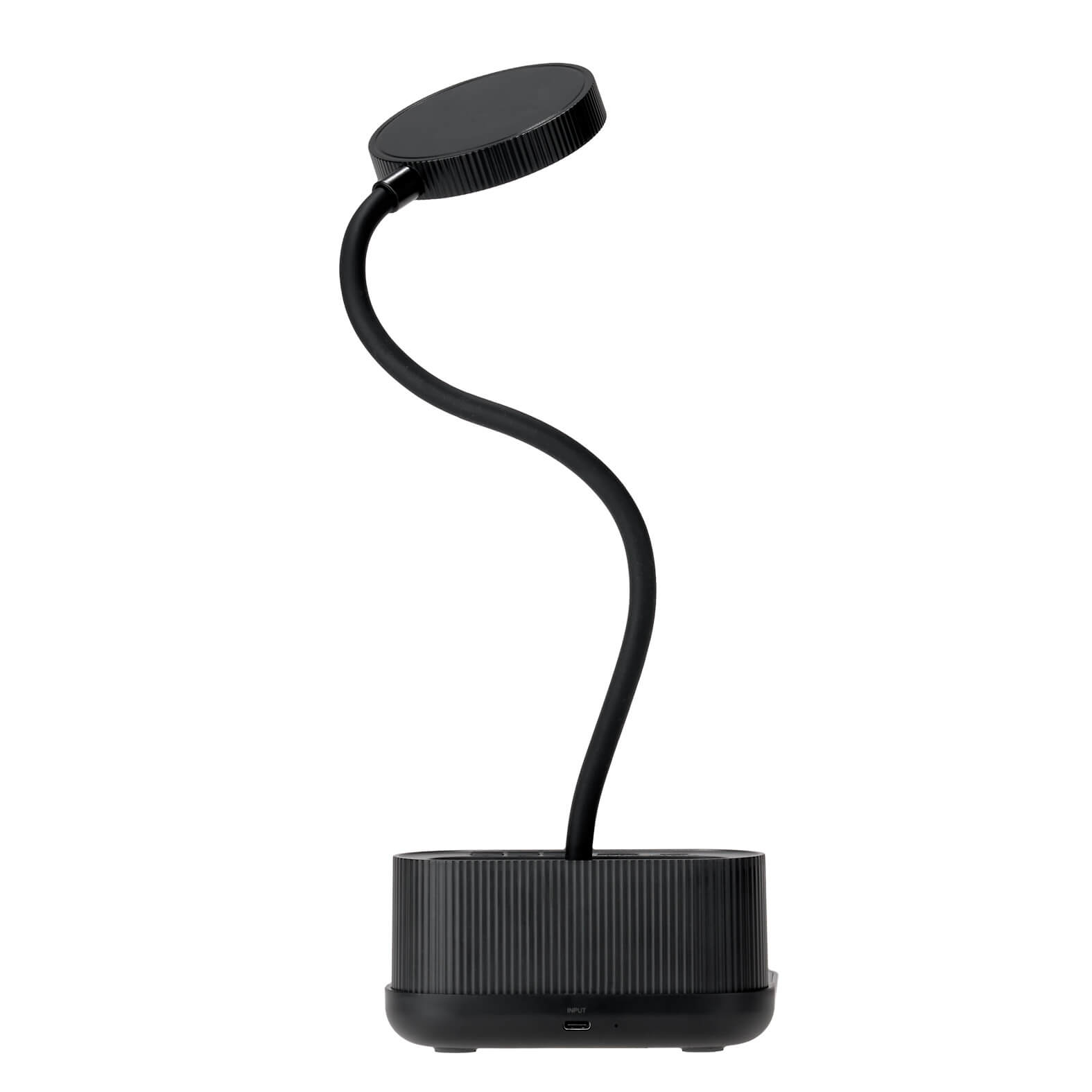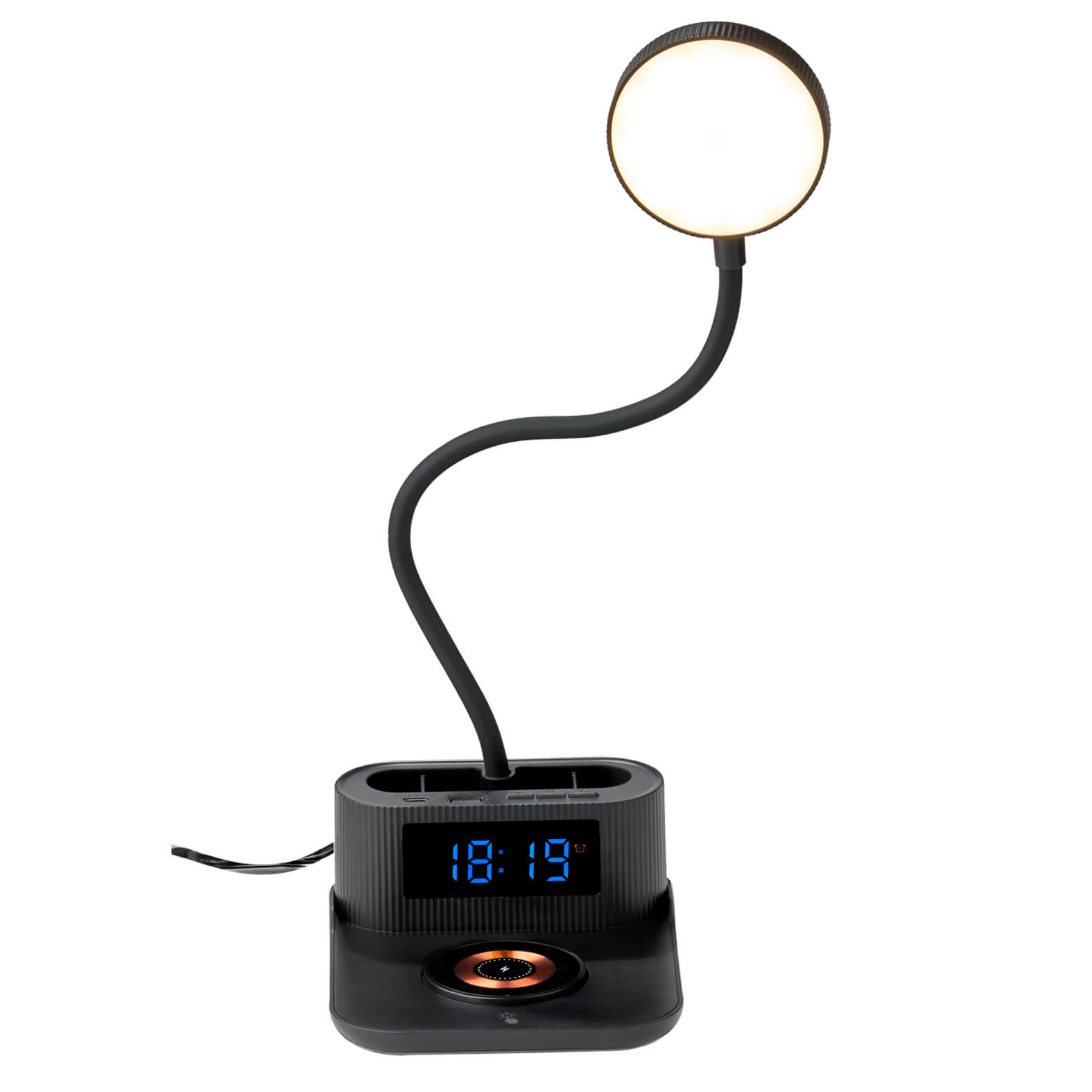 BISHOP Lámpara de escritorio con sensor touch de tres niveles, organizador, reloj digital, cargador inalámbrico, puerto USB y Tipo C. Incluye cable de carga Tipo C. (Compatible con dispositivos con tecnología Qi).