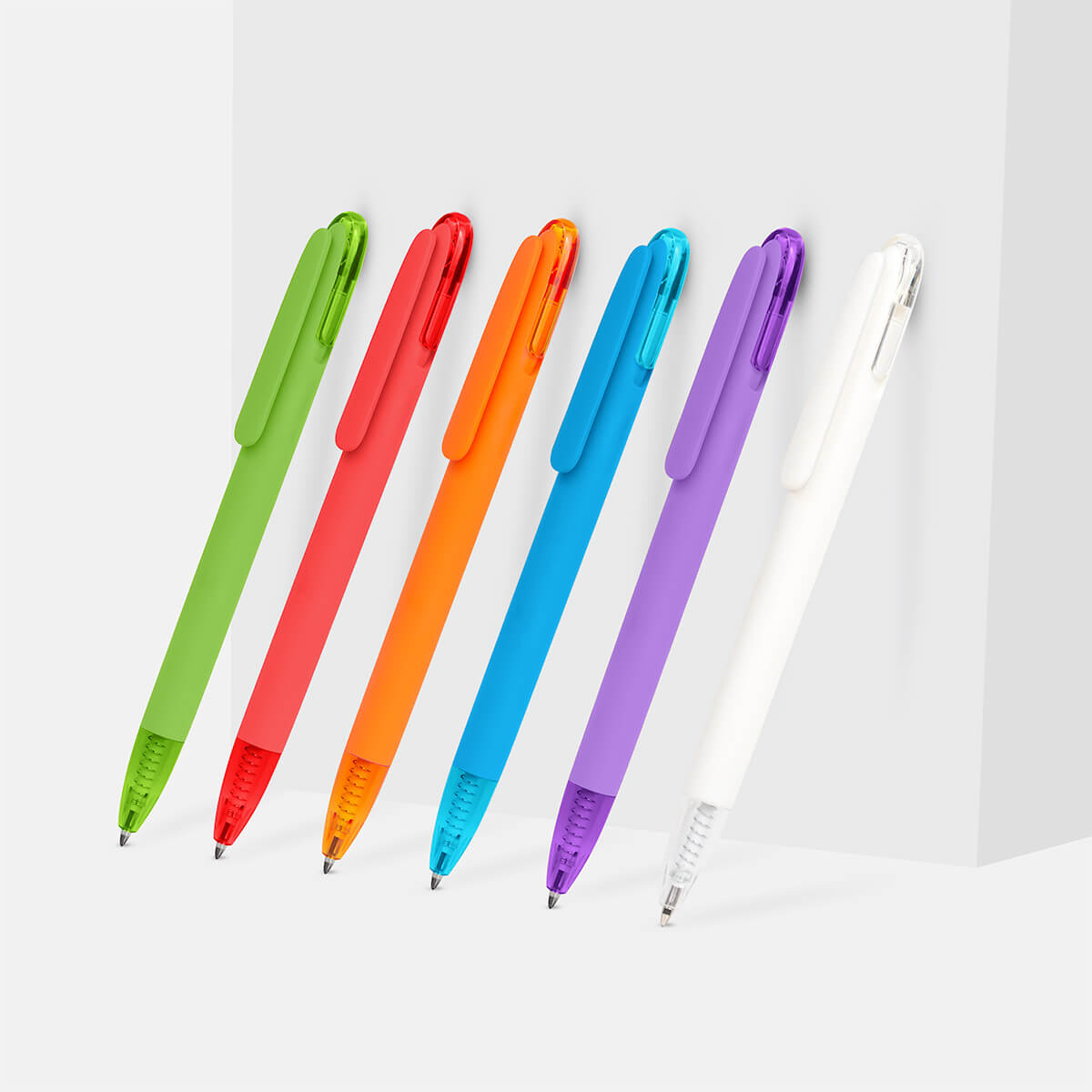 BOLÍGRAFO INKÁ - Bolígrafo de plástico con terminado rubber. Su contraste de material solido y translucido aportan un toque único a su diseño. Mecanismo pulsador.