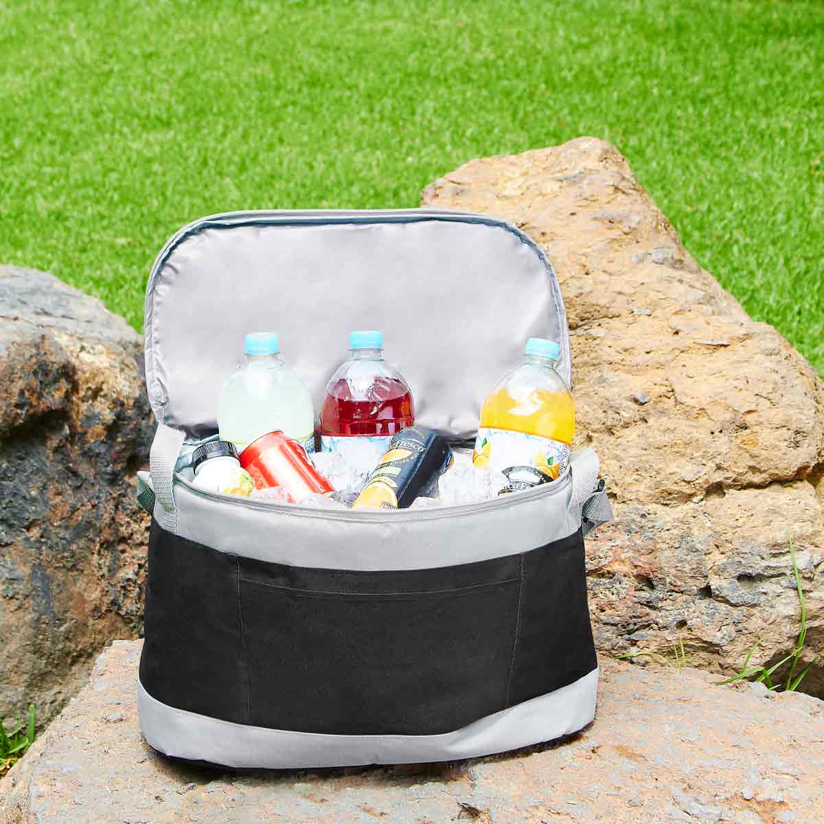 HIELERA BALTY - Interior plastificado impermeable. Bolsa principal con cierre y bolsillo frontal. Incluye asa y correa ajustable. Capacidad para 26 latas.