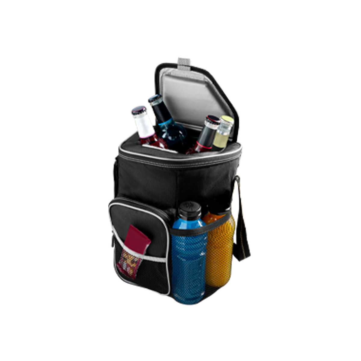 HIELERA ORGORO - Interior plastificado impermeable. Bolsa frontal con cierre y bolsillo lateral y frontal de malla. Bolsa principal con cierre y ventana superior para fácil acceso al interior. Incluye correa ajustable. Capacidad para 6 latas.