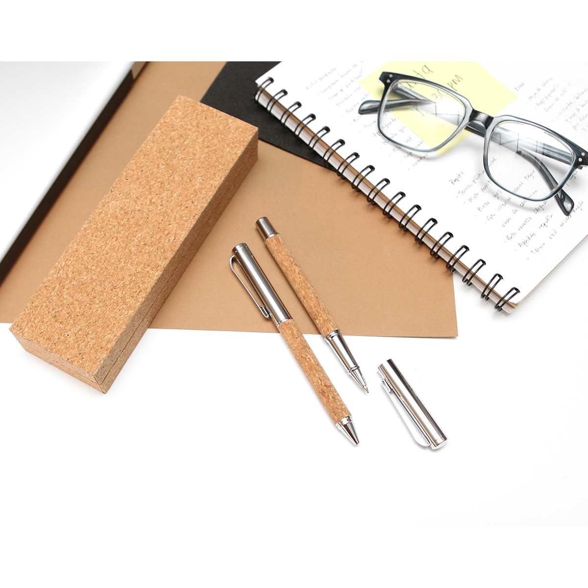 Set de plumas Lublin. - Set de roller y ball pen con barril de corcho, clip y punta en metal. Incluye estuche fabricado en el mismo material. Tinta de escritura negra.