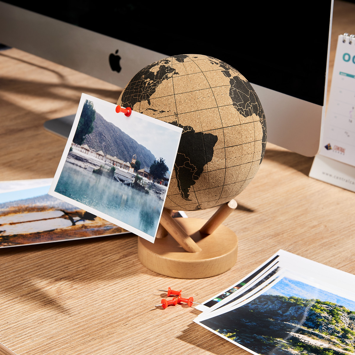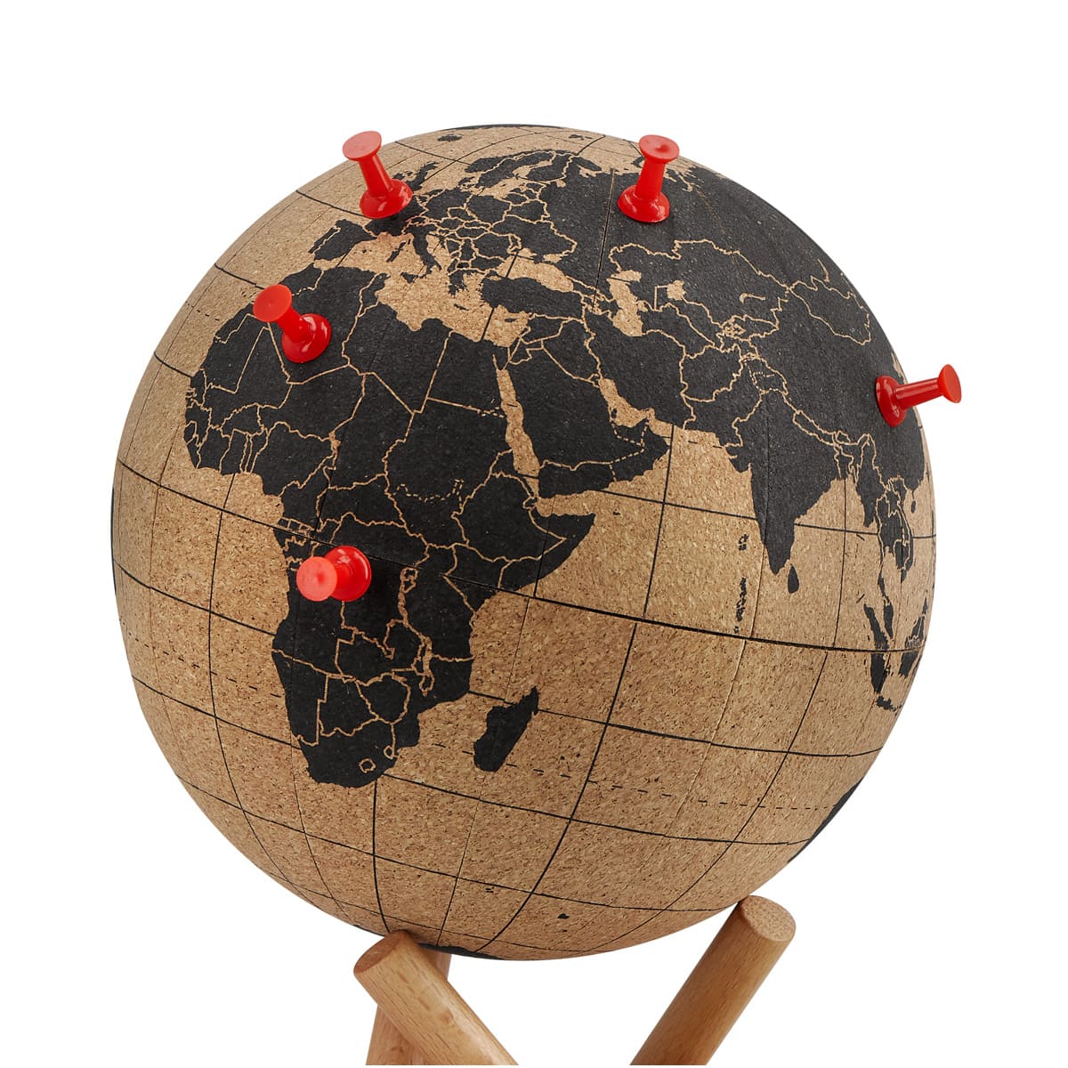 GLOBO TERRÁQUEO PHILEAS - Globo decorativo de corcho con base de madera desmontable. Incluye 6 tachuelas para marcar tus viajes realizados o para utilizar con fines educativos.