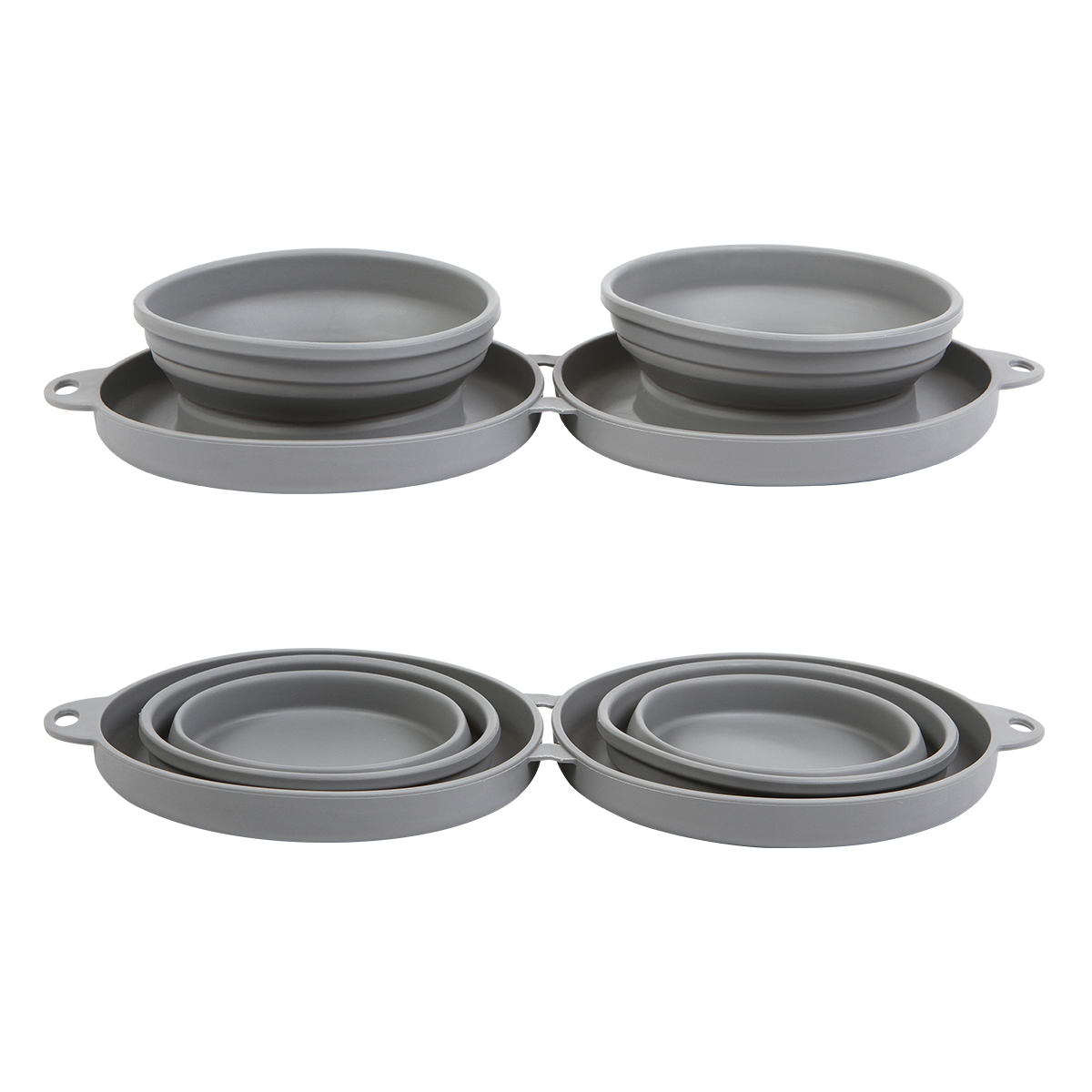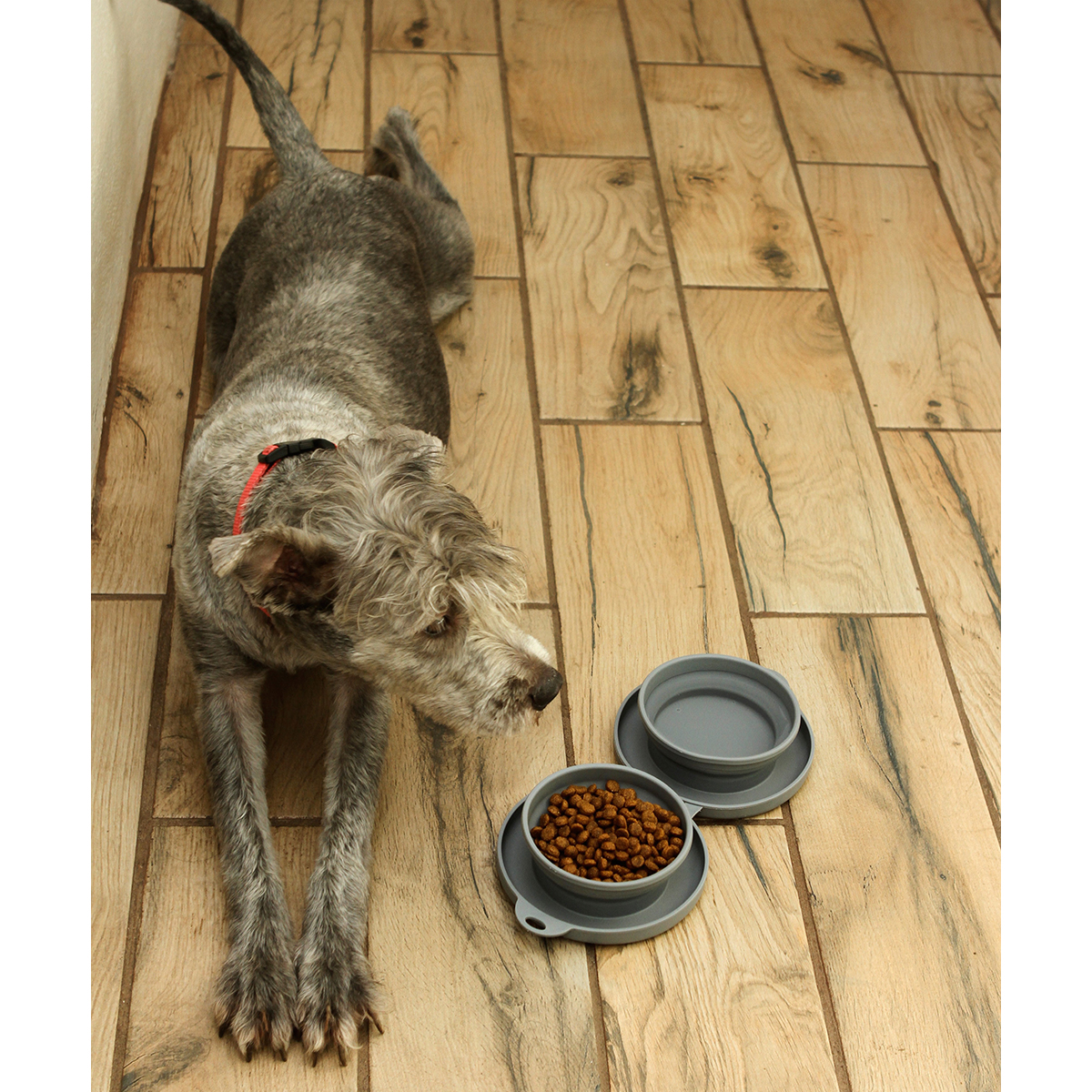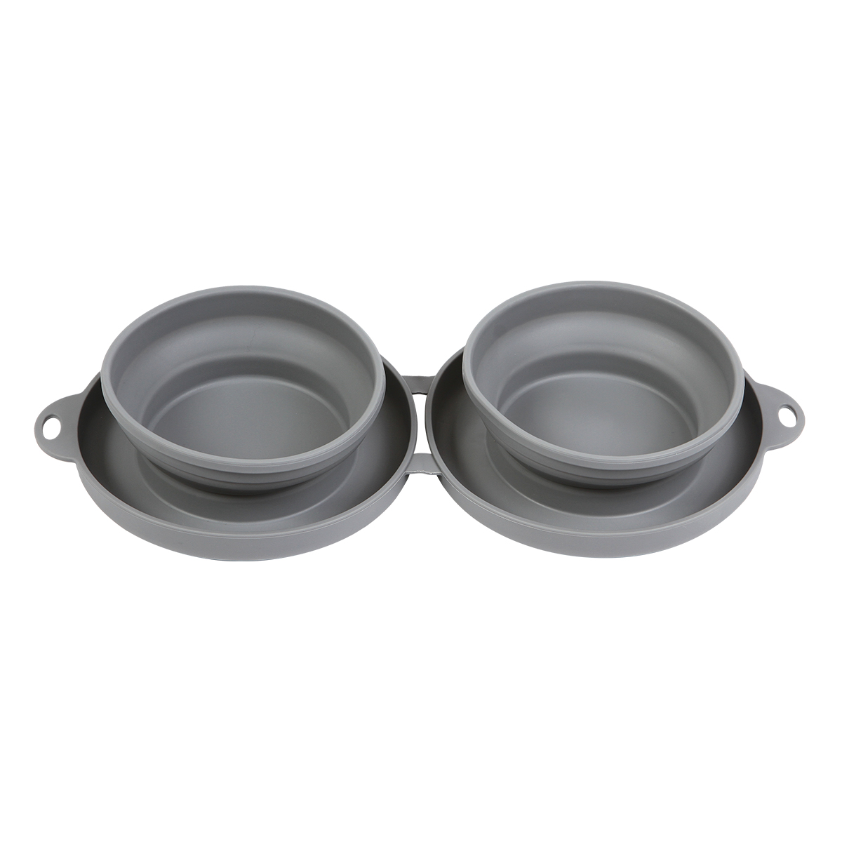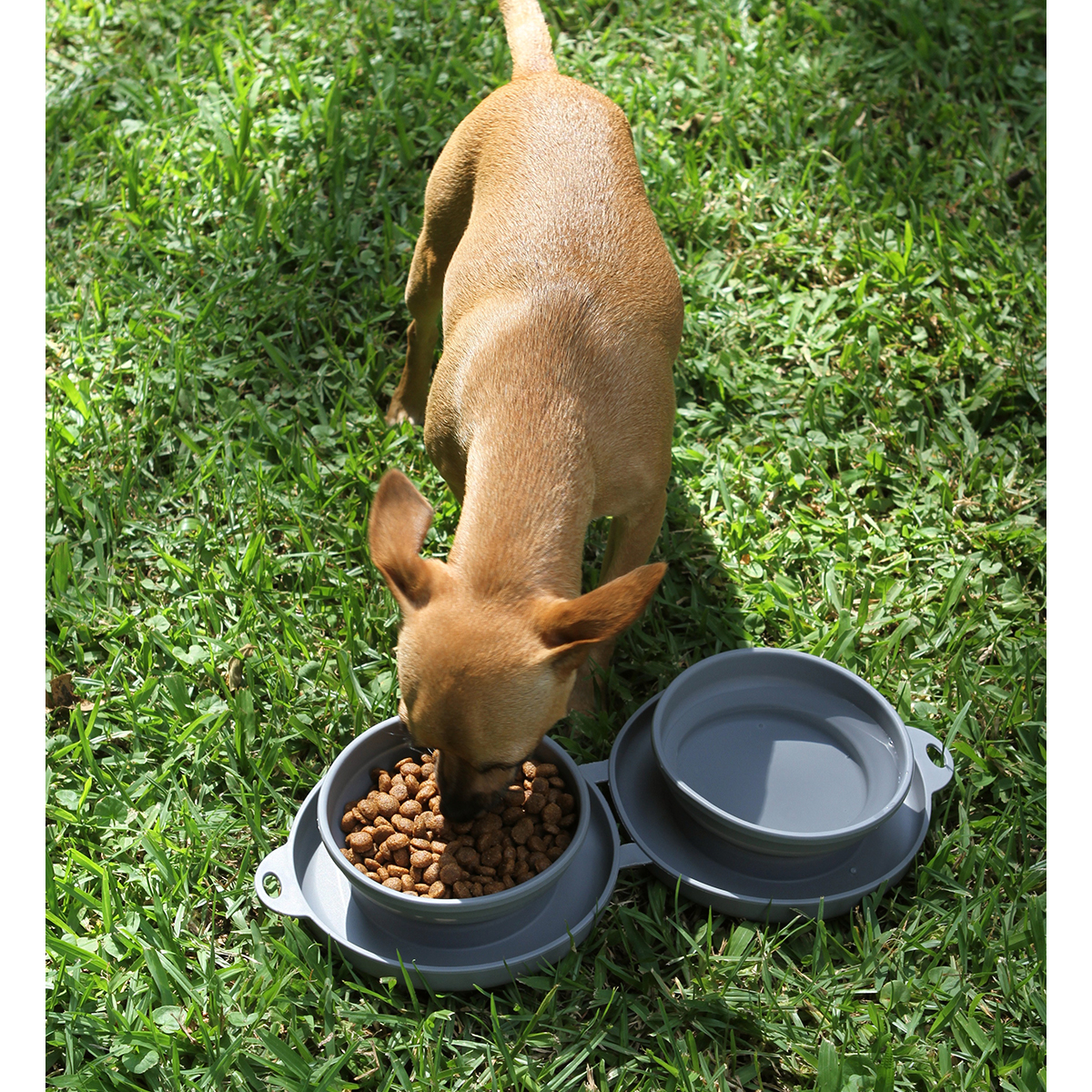 Plato Scoglitti. - Plato doble compartimento para alimento de mascota fabricado en plástico, con capacidad de 250 ml. Con diseño plegable que facilita su traslado, incluye arnés metálico.