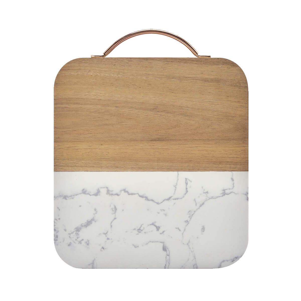 TABLA AOSTA - Tabla de cocina de mármol con madera y asa metálica color oro rosado. Incluye caja individual. La madera es un producto natural el cual puede presentar variaciones en tonalidades y vetas.