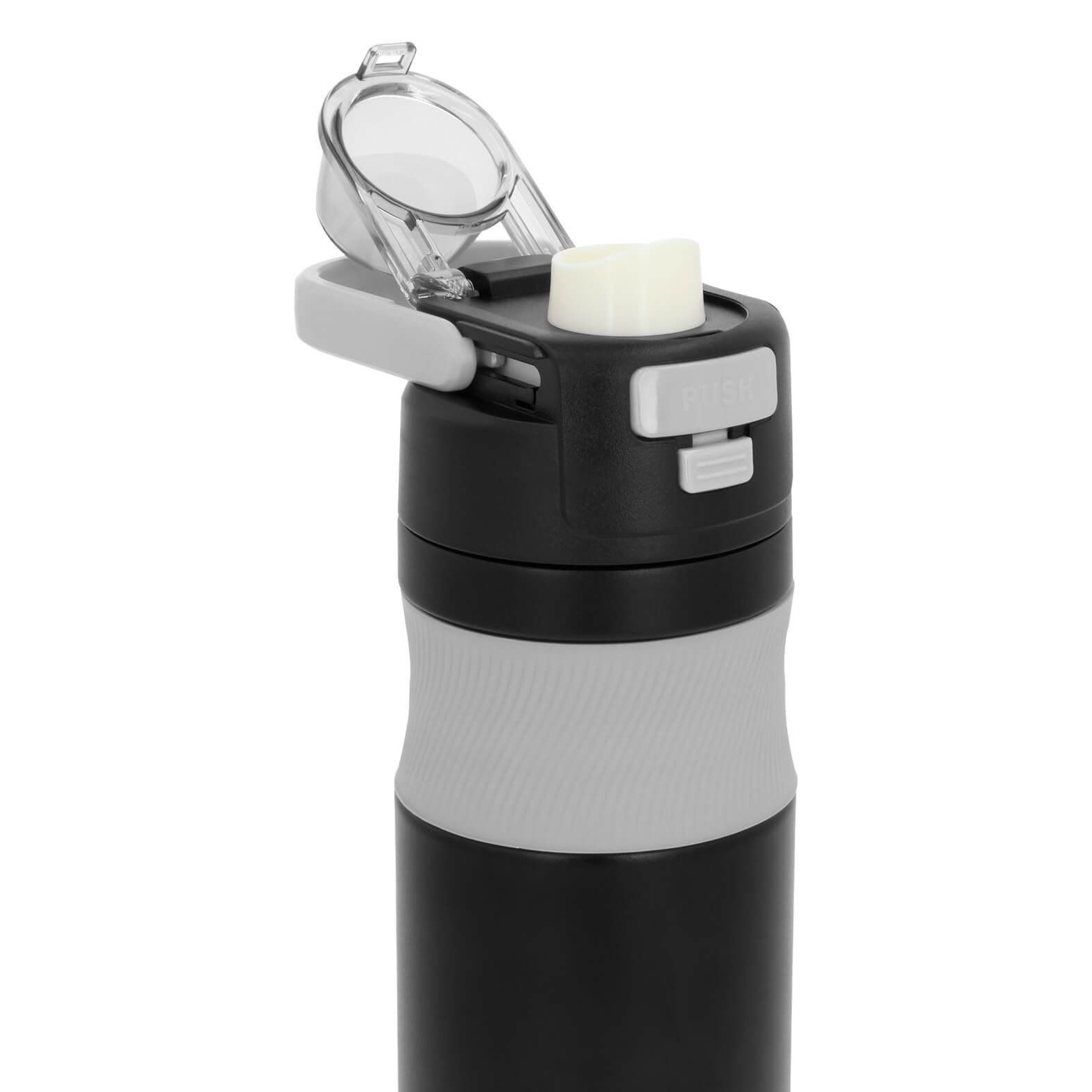 NORU Termo de doble pared de acero inoxidable, insulado al vacío con acabado rugoso, manga de silicón, tapa enroscable con botón de seguridad y asa.