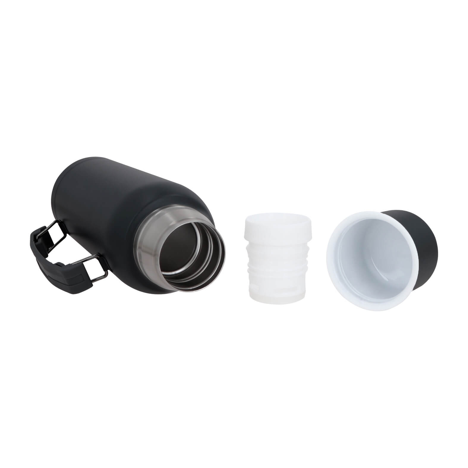 SEN Termo con doble pared de acero inoxidable, insulado al vacío, acabado rugoso, con filtro dosificador, tapa que se utiliza como vaso y asa.