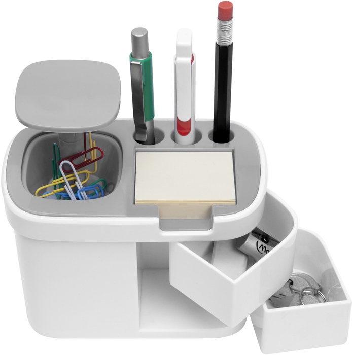 ORGANIDESK Organizador para escritorio. Cuenta en la parte superior con espacio para tres bolígrafos, notas autoadhesivas y un botón pulsador que sirve para guardar clips. Clips de colores incluidos. En la parte inferior dos cajones.