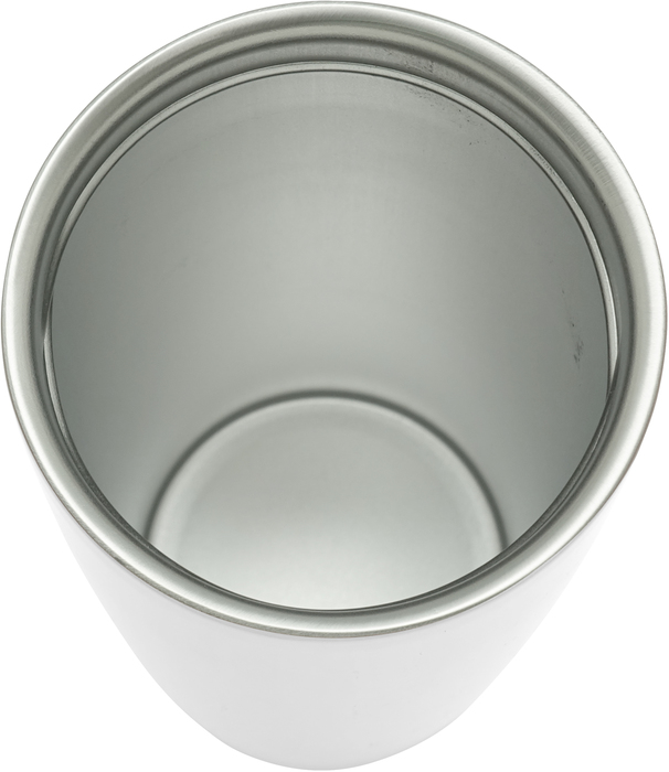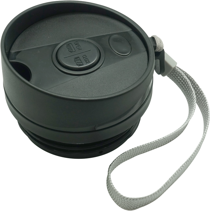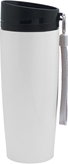 MUG "BRONX" Mug doble pared Interior acero 304 y exterior acero 201. Tapa a rosca, botón para abrir y cerrar. Lazo para sujetar en la muñeca. Base antideslizante. Mantiene las bebidas frías o calientes por más tiempo. Presentación en caja de regalo.