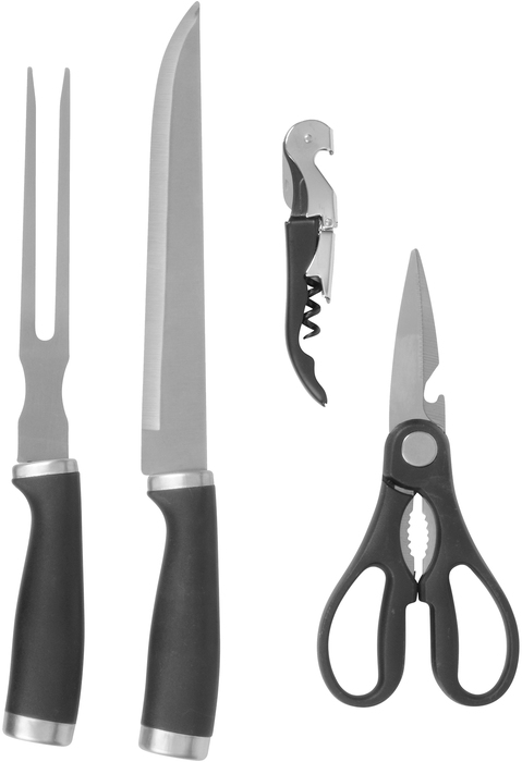 SET DE ASADO / BBQ 36 x 9,5 x 3 cm. Nylon. Set de asado en estuche con cierre. Contiene: tenedor , asador y cuchilla con mango color negro. Trae tijera y destapador de vino.(Las medidas volcadas son las del estuche).
