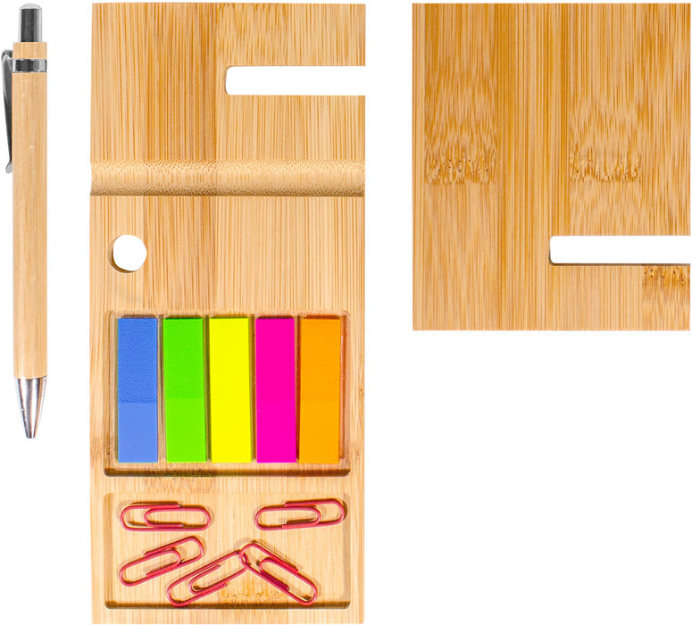 ORGANIZADOR DE ESCRITORIO DE BAMBU Organizador de escritorio compuesto por dos piezas encastrables con compartimentos para accesorios y ranuras porta boligrafo y porta celular. Parte posterior también funciona como soporte porta celular. Incluye bolígrafo (cuerpo de bambú, pulsador, clip y detalles metálicos, tinta negra), set de 5 señaladores autoadhesivos de diferentes colores y clips en color rojo. Ideal para acompañar tus tareas tanto en la oficina como home office. PRESENTADO EN CAJA DE REGALO.