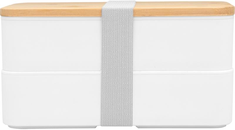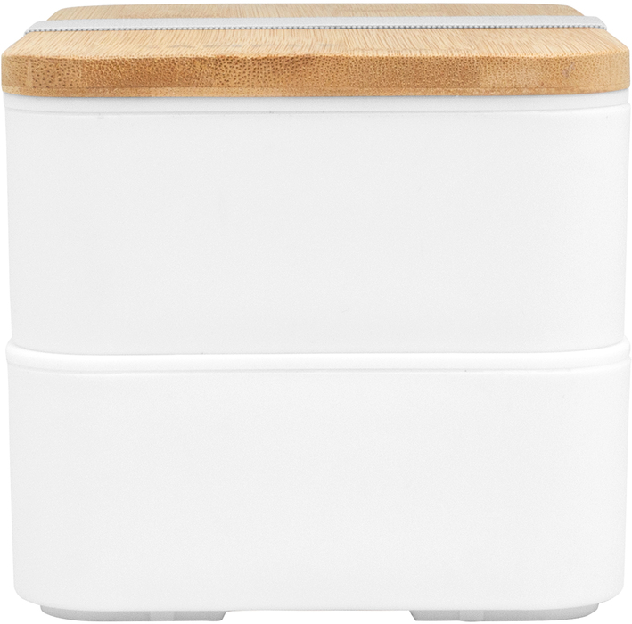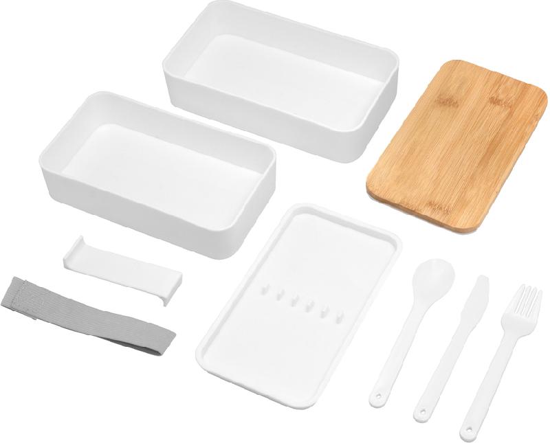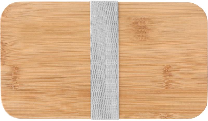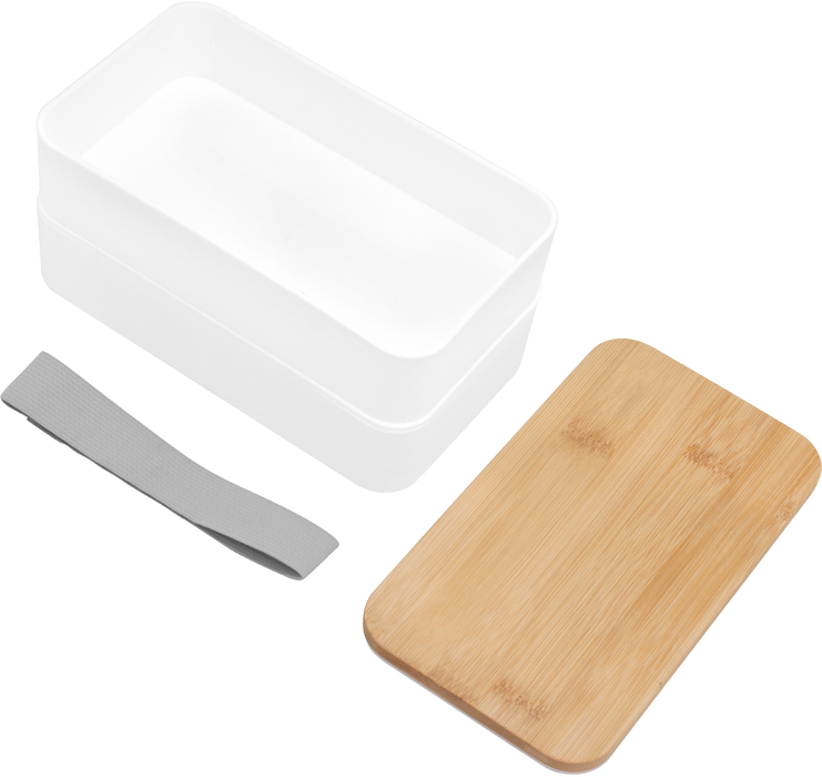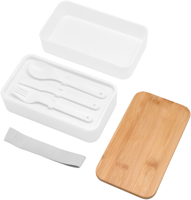 LONCHERA "BAMBOX" Contenedor de alimentos con tapa de Bambú. Posee dos compartimentos plásticos, un separador y bandeja porta set de 3 cubiertos (cuchillo, tenedor, cuchara). La tapa de bambú debe presionar firmemente la bandeja donde se fija el juego de cubiertos. Cierre con sujeción elástica color gris. Producto apto para microondas (sin la tapa). Importante: solo se puede calentar la comida, NO sirve para cocinarla.