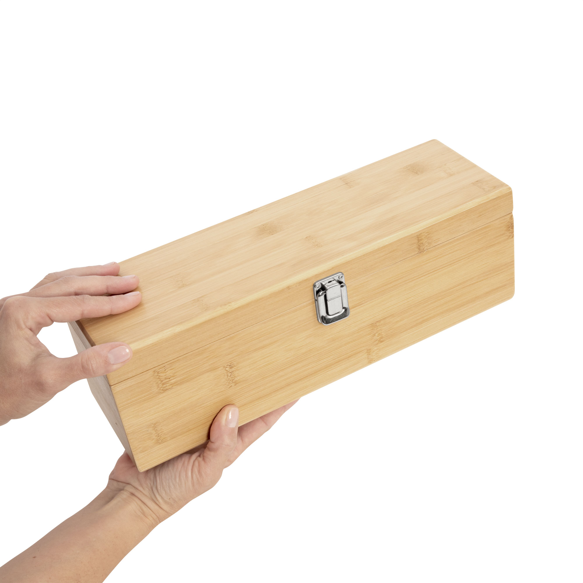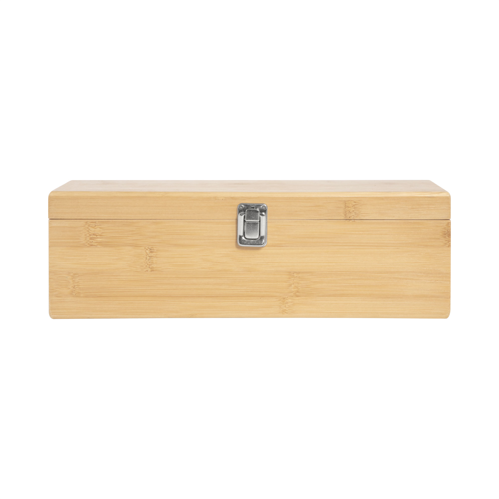Set de vino "VINICIUS" Set de vino. Caja de bambú portabotellas con cierre metálico. Bandeja de eva con set de 4 accesorios: sacacorchos, anillo antigoteo, tapón y vertedor