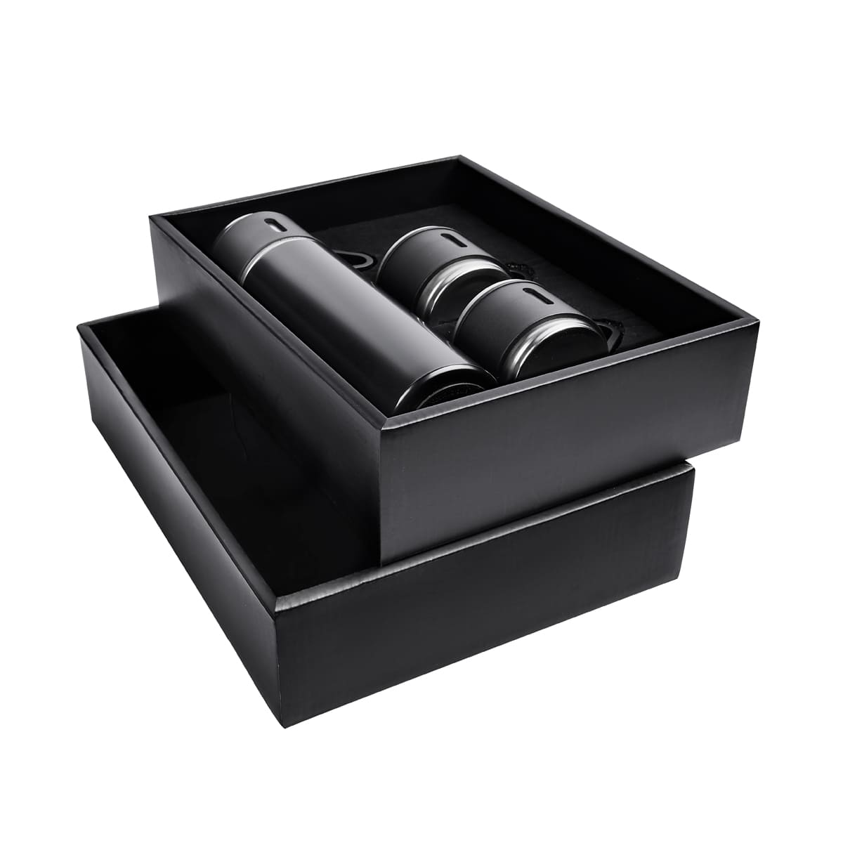 MATERIAL: Acero Inoxidable / Plástico MEDIDAS: 6.8 x 23 cm Termo / 5.9 x 5.9 cm Tazas / 30.5 x 7.3 x 23.5 cm Caja IMPRESION: Láser / Serigrafía MED. EMPAQUE: 62.5 x 24 x 49.5 cm PESO EMPAQUE: 1.21 Kg PIEZAS EMPAQUE: 12