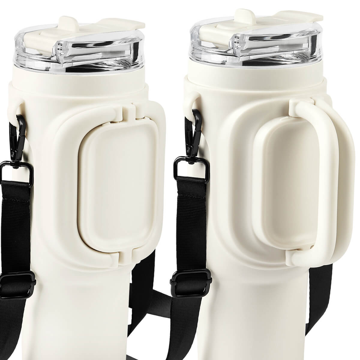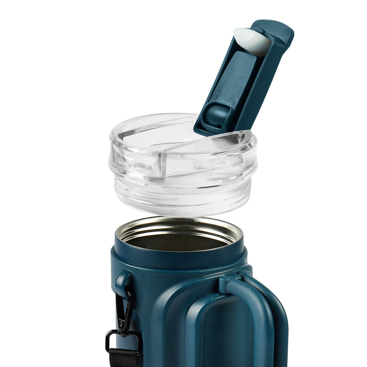 TERMO CANADA - Termo doble pared. Cerrado al vacío. Pared interna y externa de acero inoxidable. Terminado rugoso que facilita su agarre. Incluye tapa de plástico con sistema de rosca y la sobretapa mulitfuncional, permite beber por medio de su boquilla clásica o a través de su boquilla plegable con popote. Su diseño innovador incorpora un asa plegable para un uso más práctico y un asa para hombro ajustable y removible, con broches metálicos. Mantiene las bebidas calientes hasta por 6 hrs y frías hasta por 8 hrs. Capacidad de 30 Oz. Base de 7.4 cm de diámetro. Incluye caja individual.
