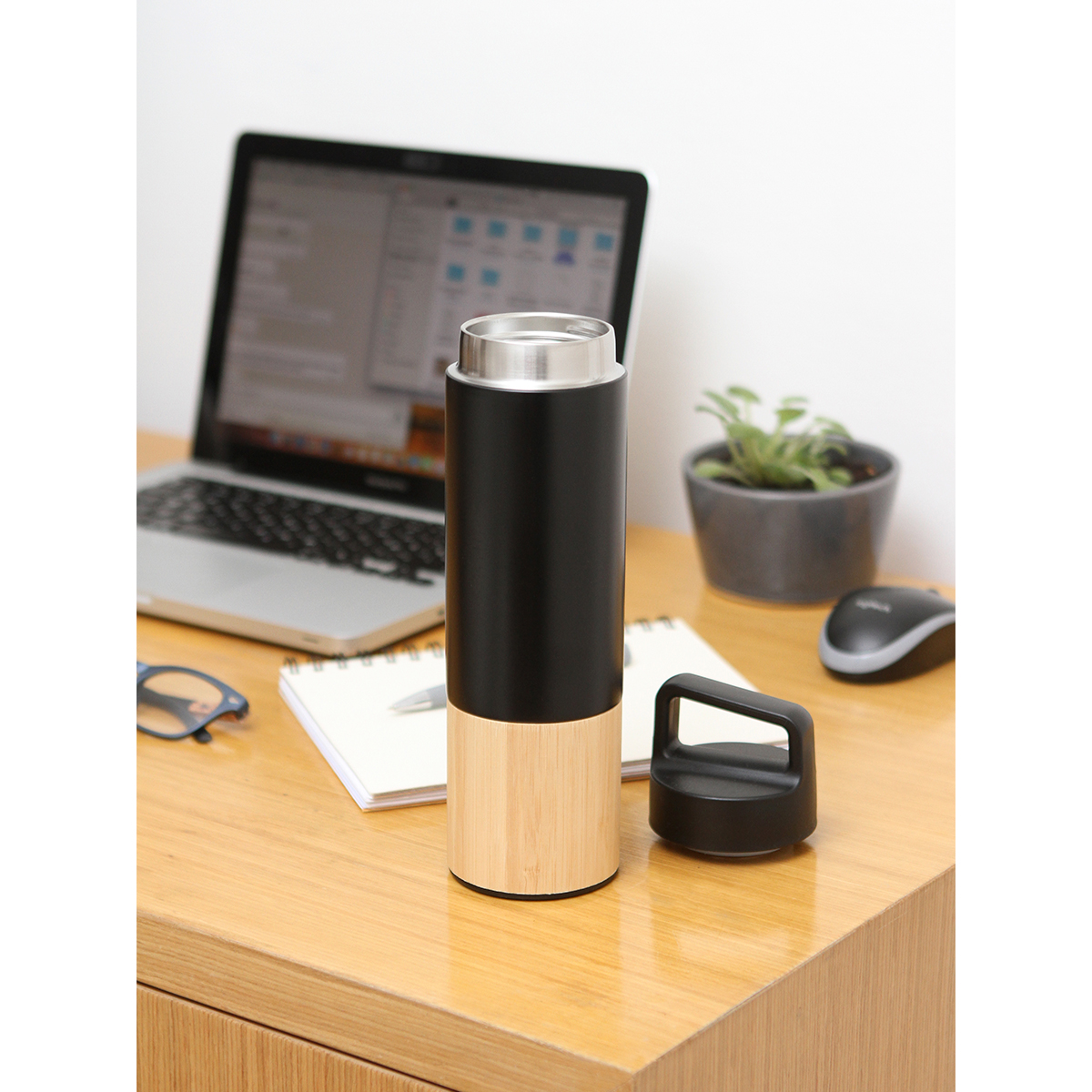 Termo Amberes. - Termo de acero inoxidable doble pared, detalle de bambú en la parte baja y tapa de plástico con agarradera. Fabricado en materiales de grado alimenticio, mantiene bebidas frías o calientes por un largo tiempo. No usar en microondas. Capacidad de 500 ml. Incluye caja de cartón individual.