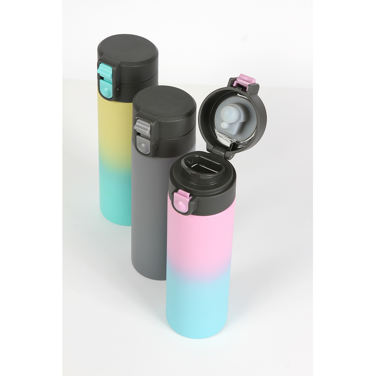 Termo Pagai. - Termo bi-tono doble pared de acero inoxidable, con tapa plástica y botón de seguridad. Fabricado en materiales de grado alimenticio, mantiene bebidas calientes por un largo tiempo, no usar en microondas. Capacidad de 500 ml. Incluye caja de cartón individual.