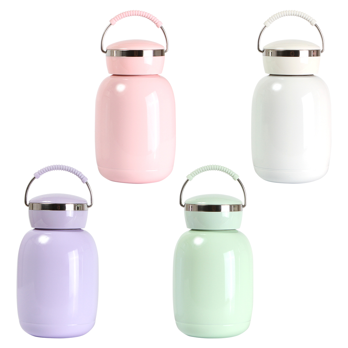 Termo Solano. - Termo de acero inoxidable doble pared con tapa de plástico, asa metálica y detalle de color en asa. Fabricado en materiales de grado alimenticio, mantiene bebidas frías o calientes por un largo tiempo. No usar en microondas. Capacidad 230 ml. Incluye caja de cartón individual.