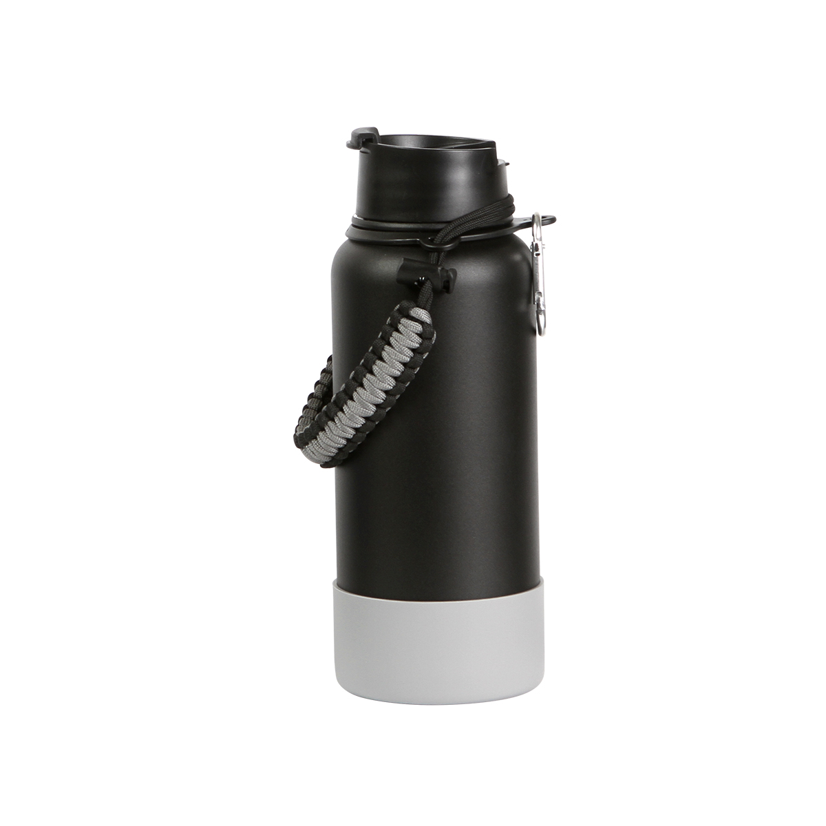 Botella Sarnen. - Botella deportiva, fabricada en acero inoxidable doble pared. Tapa de rosca con boquilla. Cuenta con capacidad de 1,000 ml. Incluye arnés, correa con detalles en gris y base de silicón anti derrapante.