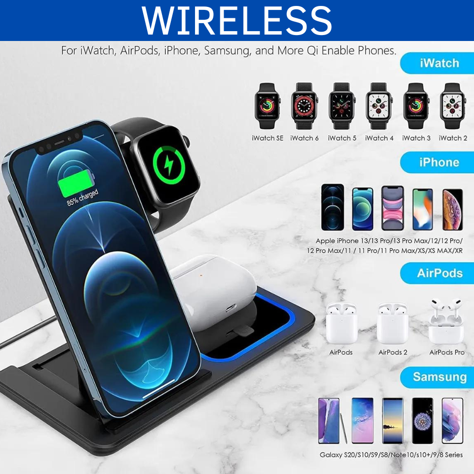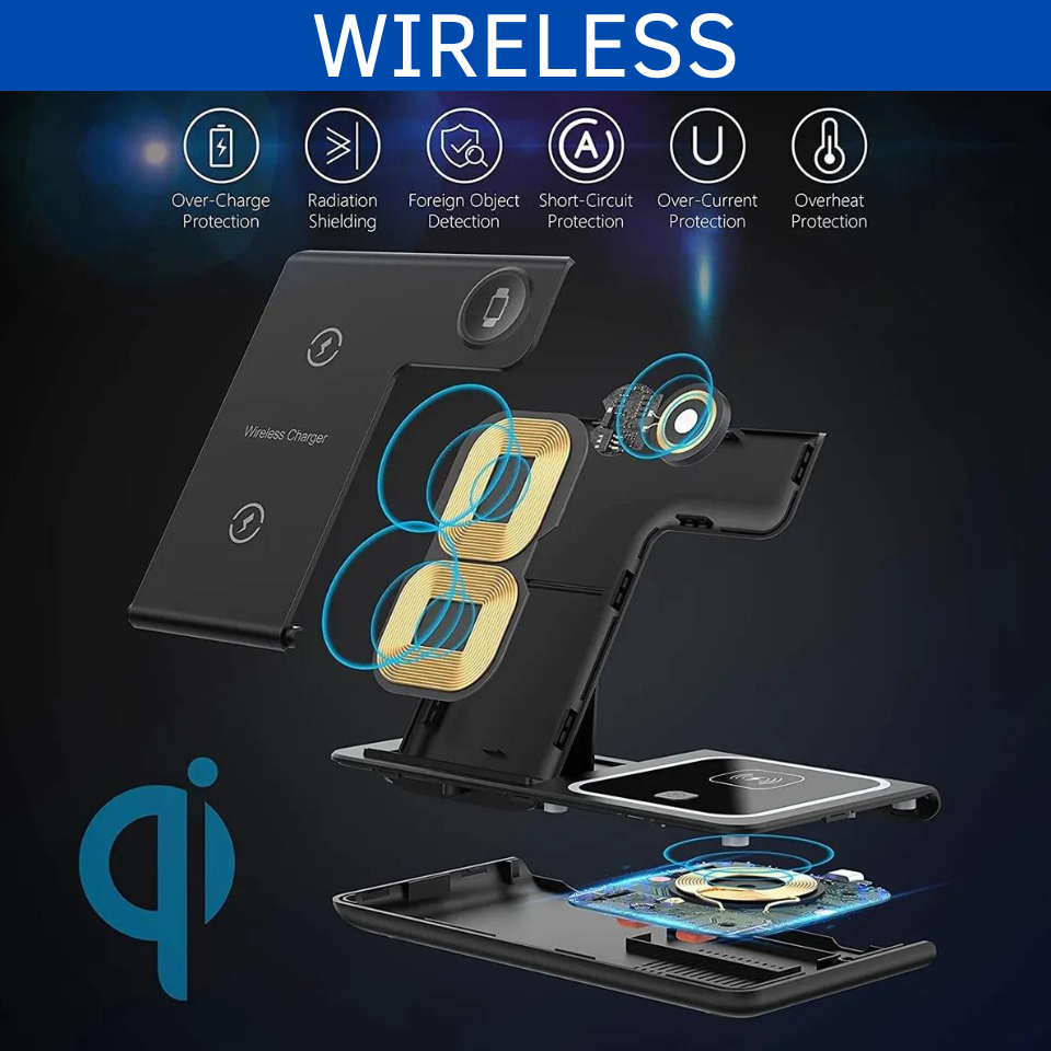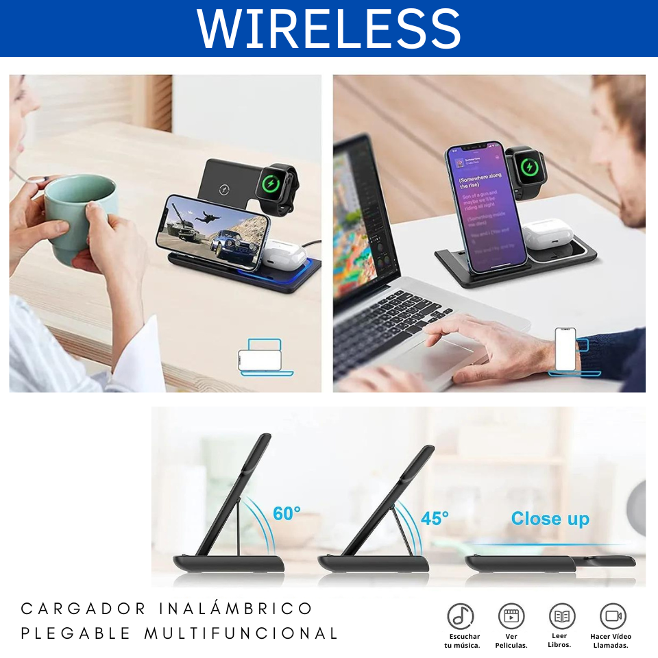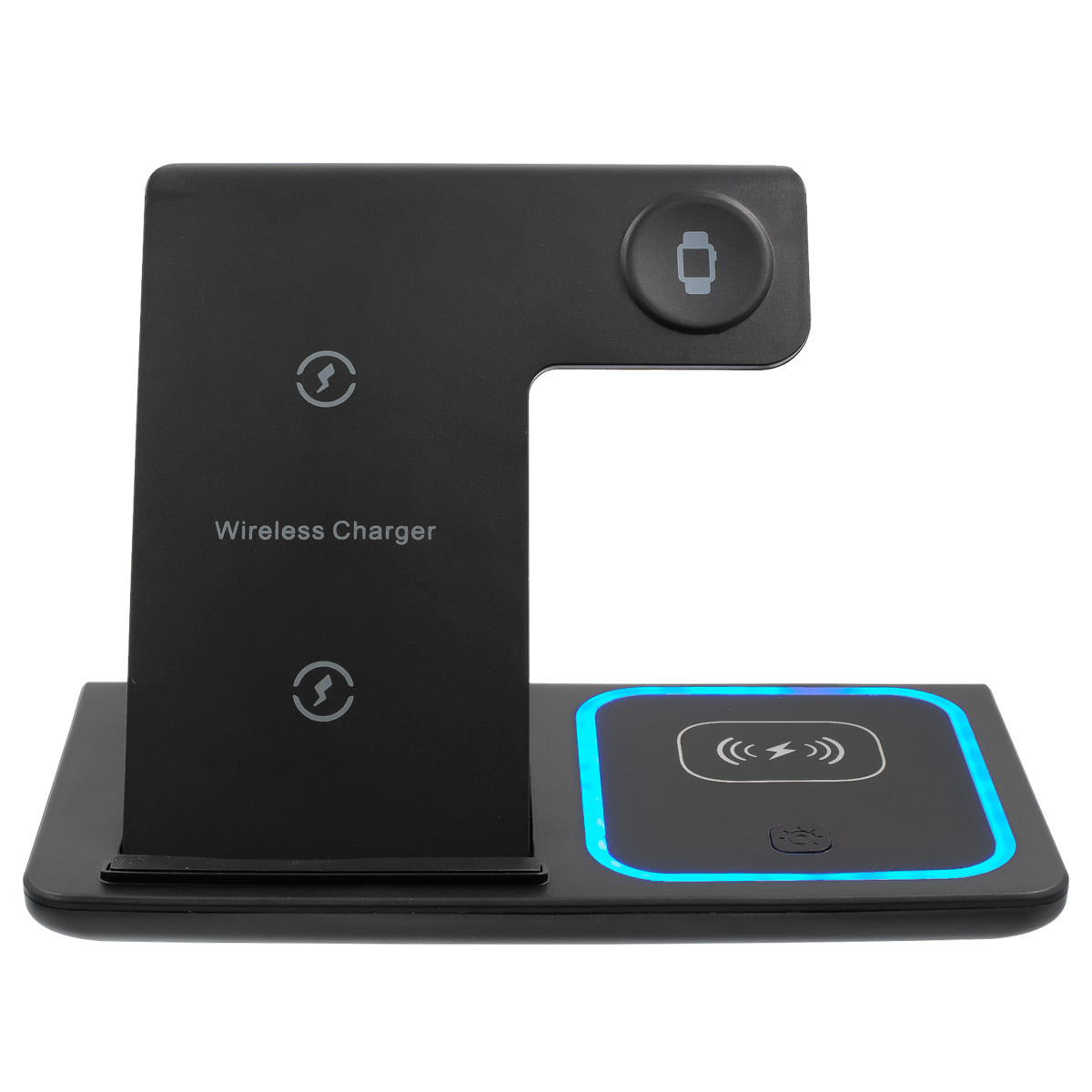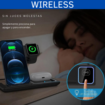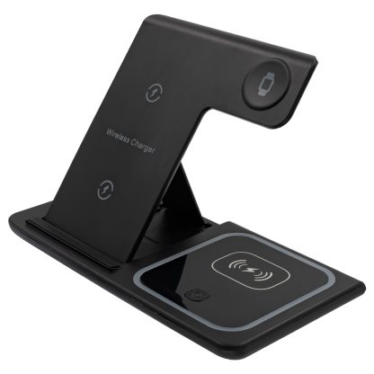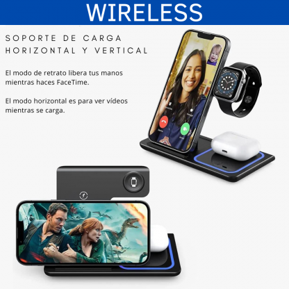 ESTACION DE CARGA INALÁMBRICA CLASSIC Estación de carga inalámbrica portátil 3 en 1 (smartphone, smartwatch y auriculares) en color negro con indicador LED azul de encendido (cuenta con botón para apagar el LED), doble zona de carga para smartphone. Compatibilidad Dispositivo y/o gadgets que cumplan con el estándar Qi. Especificaciones -Requiere adaptador de carga 9v-2A, 5v-3A -Rango de transmisión: 10 mm -Poder de Carga: smartphone: 15w, auriculares: 3w y smartwatch: 2.5w -Interface: USB Tipo C Incluye 1 Manual y 1 cable USB tipo C