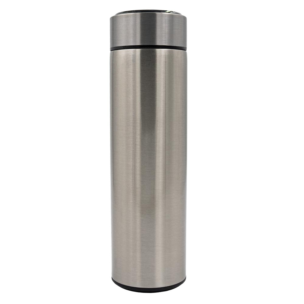 Elegante termo con capacidad de 500 ml fabricado en acero inoxidable grado alimenticio recubierto con pintura para un mejor agarre (excepto color plata). Cuenta con una pantalla digital en la tapa que muestra la temperatura real del líquido (se enciende al tocar la superficie superior de la tapa).