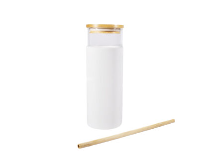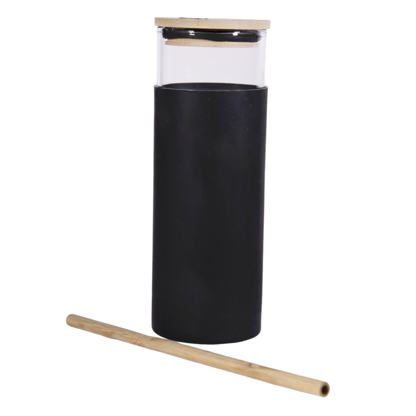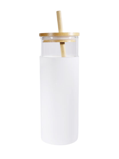 VASO DE VIDRIO KARDANI CAPACIDAD DE 500ML Vaso de vidrio con protector de silicona, tapa de bambú con orificio para popote. Incluye un popote de bambú.