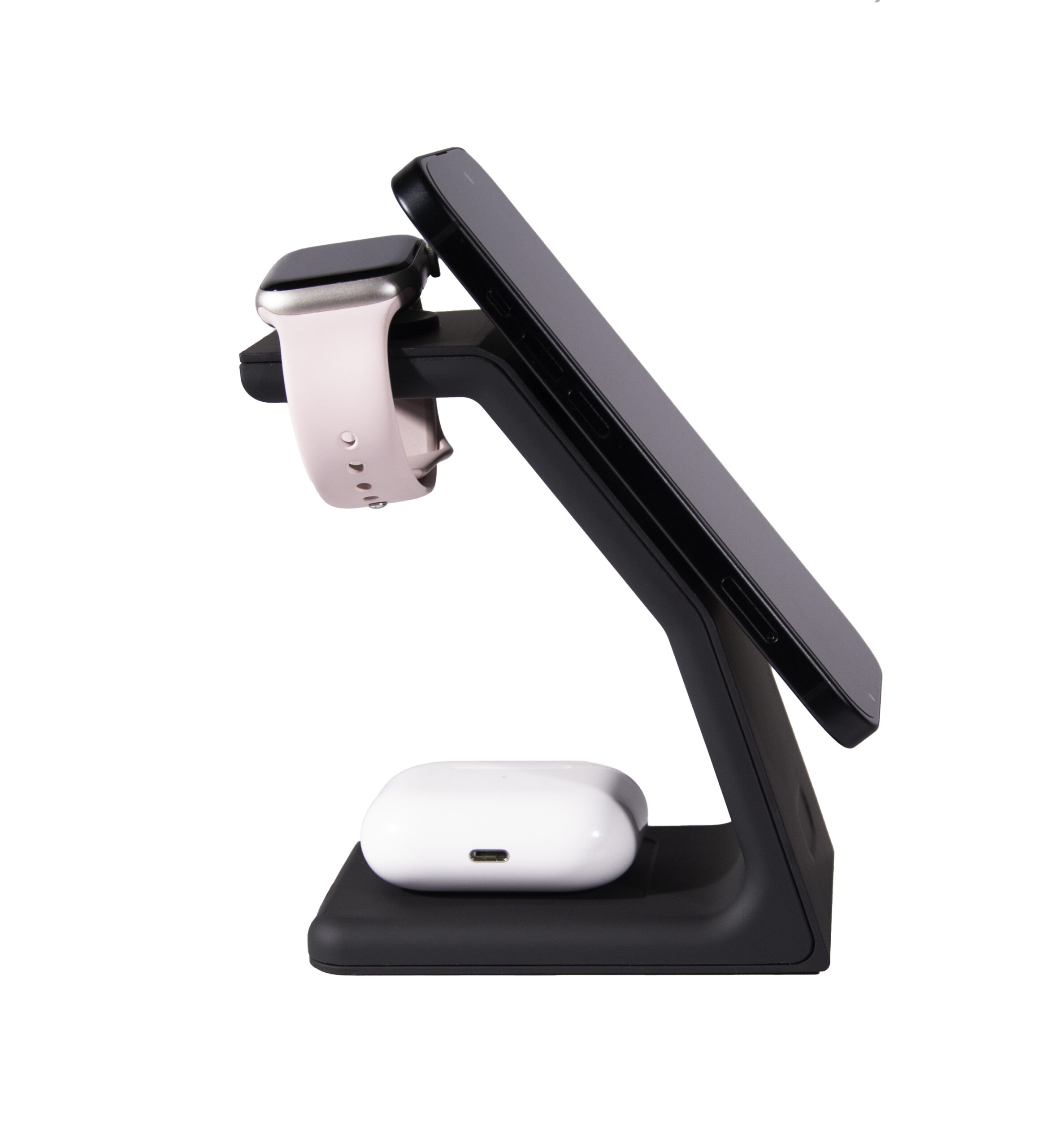Estación de carga inalámbrica con carga simultánea para smartwatch, smartphone y auriculares en un solo dispositivo.