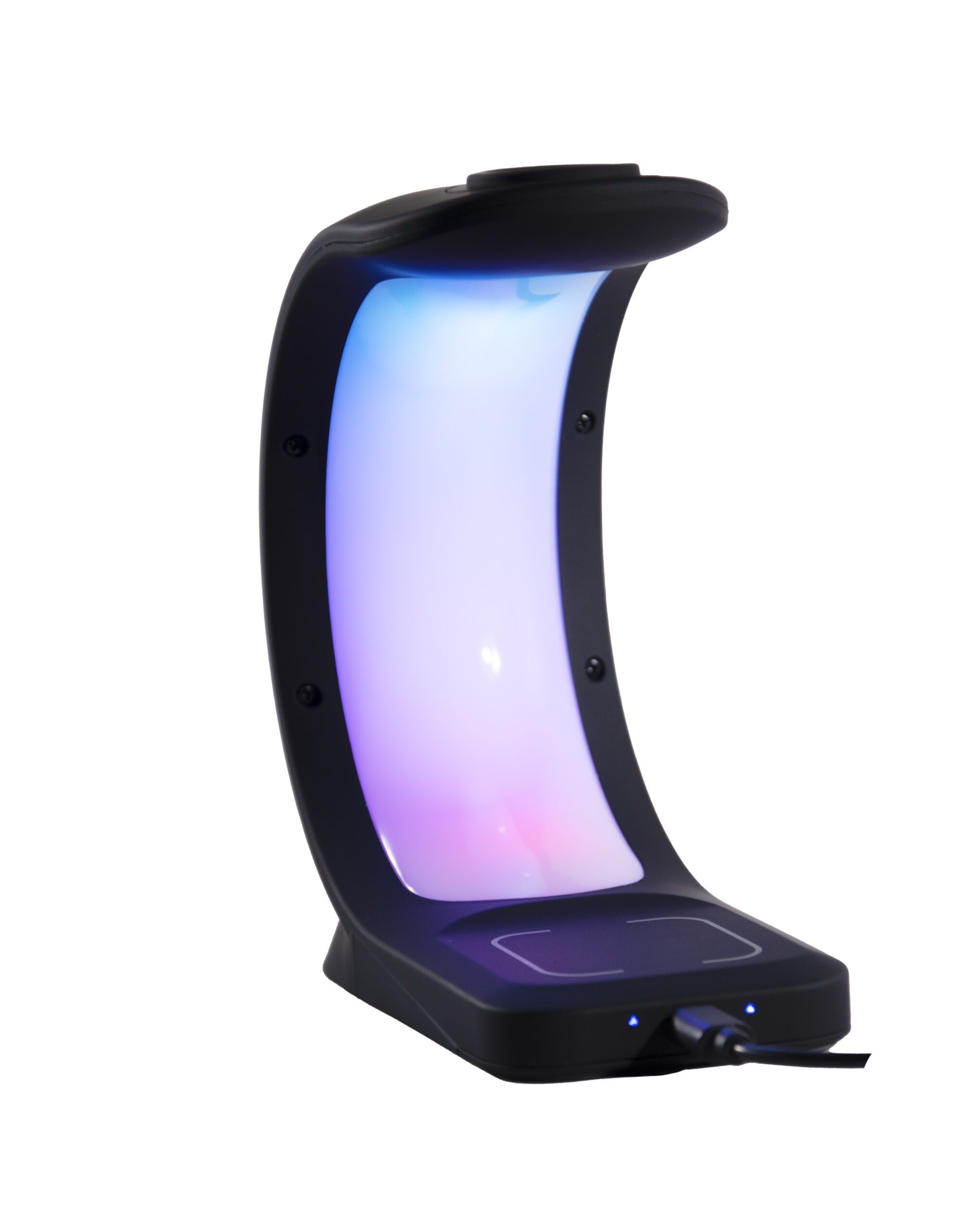Cargador con velocidad de carga de 15W, equipado con luces RGB en 4 tonalidades independientes. Dispone de un botón táctil para un fácil manejo. Ofrece áreas específicas para cargar smartphones, auriculares y smartwatch. Compatible con dispositivos Android e iOS.