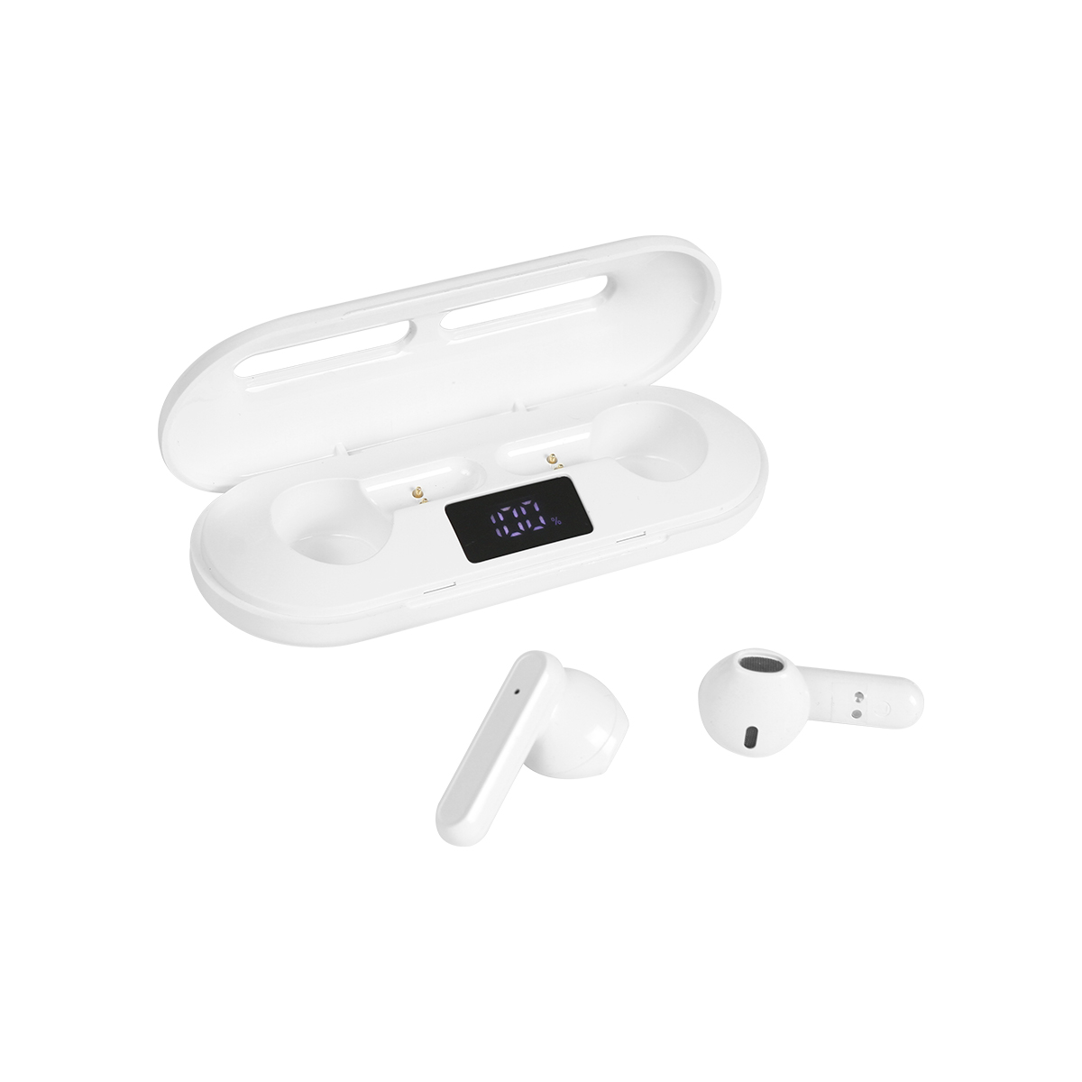 Audífonos Tulcea. - Audífonos con conexión de sonido sin cables con función touch, estuche de carga fabricado en plástico ABS, con pantalla en la parte interior donde se muestra el nivel de batería de los audífonos, tiempo de reproducción de música de 3 a 4 horas. Carga a través de cable USB (incluido). Incluye caja de cartón individual.