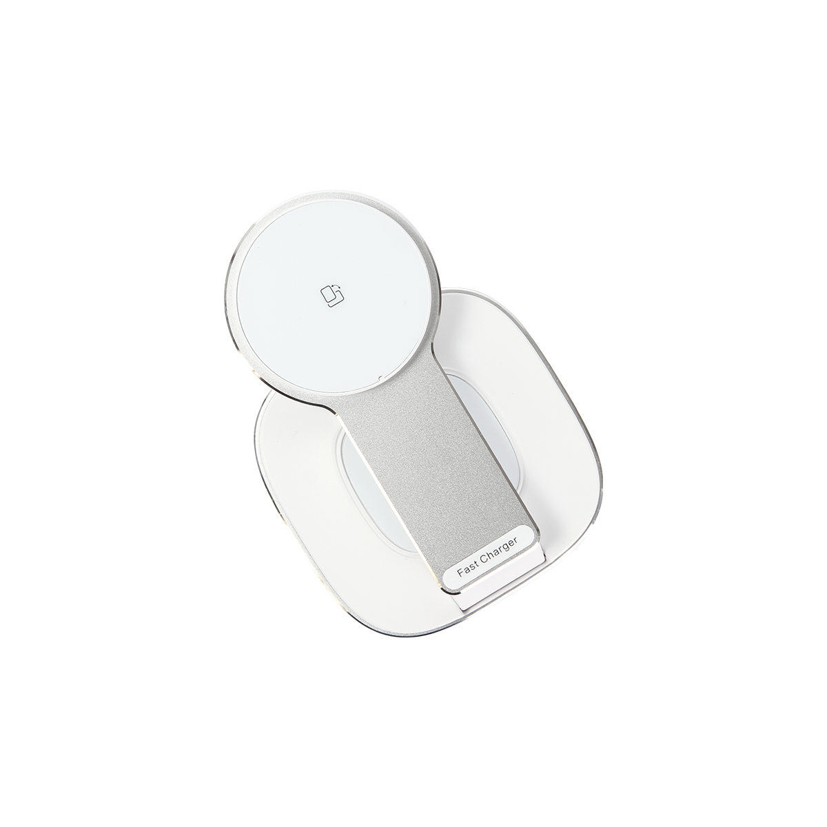 Cargador Elva. - Cargador inalámbrico multifunción (reloj, audífonos y celular), fabricado en ABS, Policarbonato (PC), silicón y aleación de aluminio. Potencia de carga de hasta 15 W.  Diseño plegable.