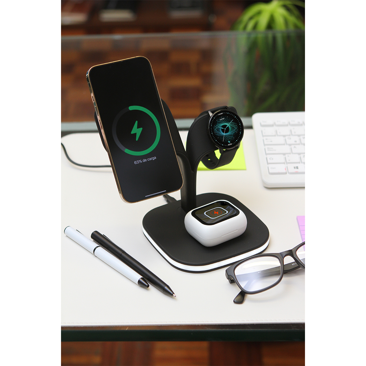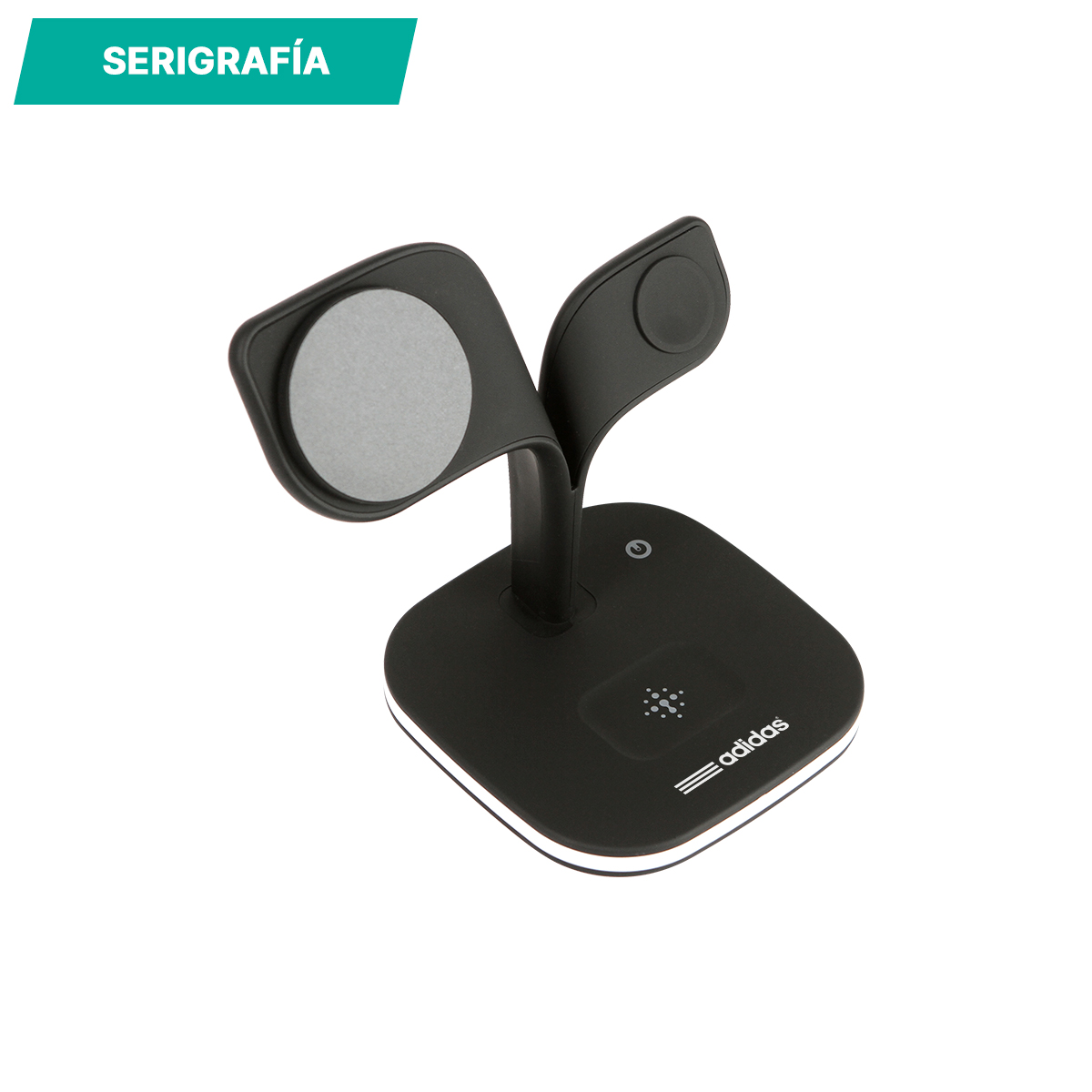 Cargador Murillo. - Cargador inalámbrico fabricado en plástico ABS y plástico de policarbonato (PC), compatible con celular, reloj y audífonos. Potencia de carga de 5w/7,5w/10w/15w para celular, 2,5w para reloj inteligente y 3W para audífonos inalámbricos.