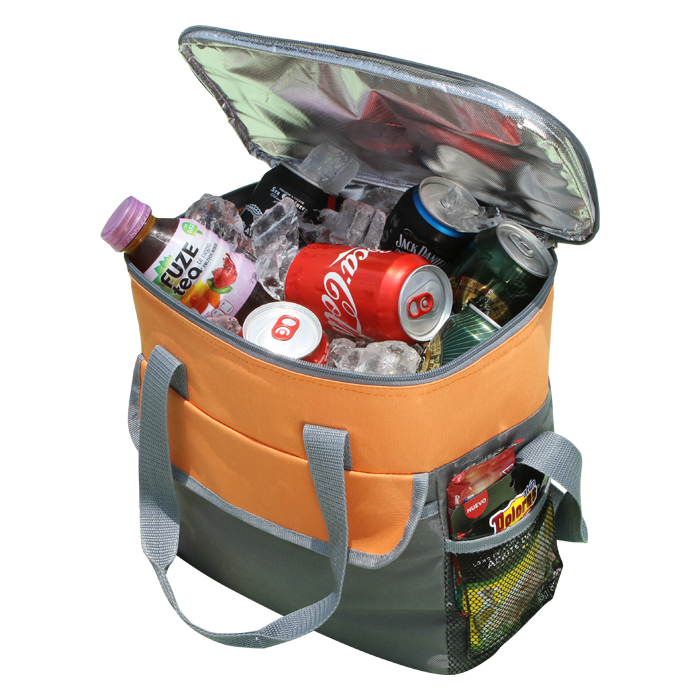 Hielera Kuper. - Hielera fabricada en poliéster 600D con forro de PVC y aluminio, compartimento frontal con bolsas laterales de malla, asas superiores y correa para hombro, Capacidad para 16 latas .