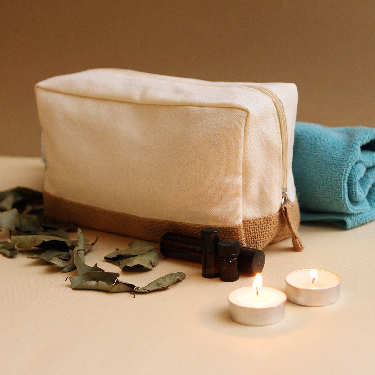 Cosmetiquera Plock. - Cosmetiquera bi-tono fabricada en algodón y yute; con cierre superior y gran espacio para impresión. Tiene un gran espacio para satisfacer sus necesidades de almacenamiento.