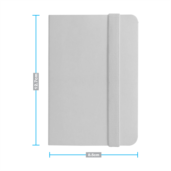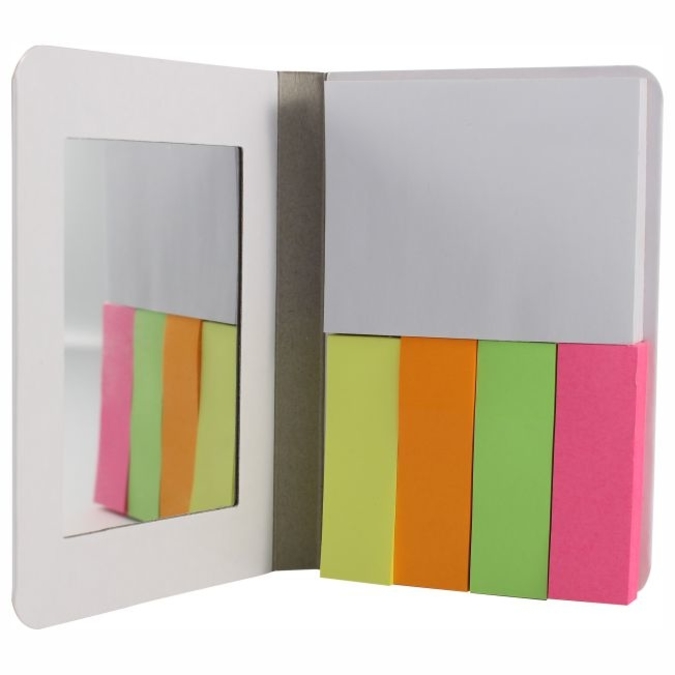 Libreta Réflex Notas y separadores adhesivos en presentación tipo libreta. Simulación de espejo en interior de portada. Cierre elástico blanco. Cartón color blanco con acabado brillante. Se entrega plastificada para garantizar la protección, y mejorar la presentación de cada una de las piezas.