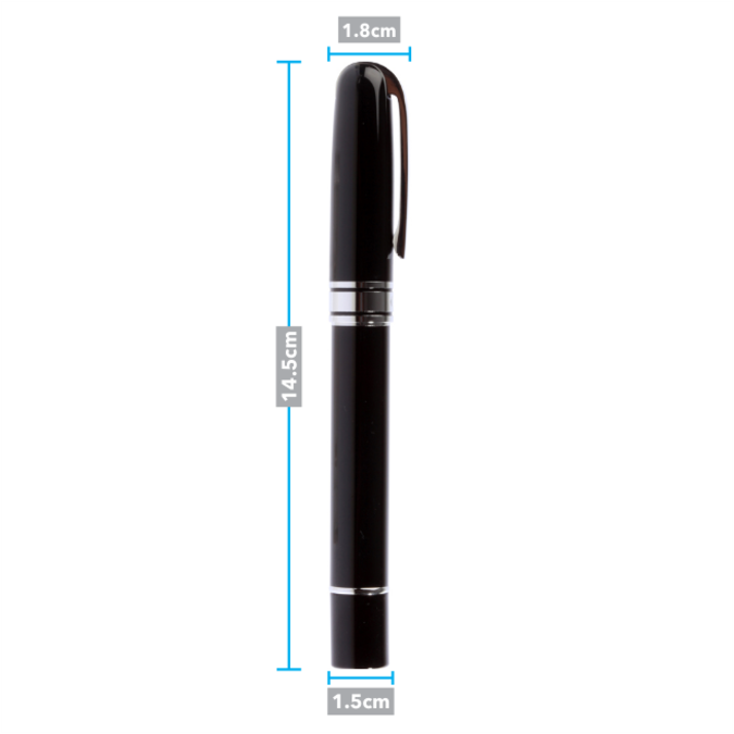 Linterna Sante Linterna metálica con apariencia de bolígrafo, ideal para colocarla en el bolsillo. Luz led. Disponible en color negro brillante, cromo y acero. Detalles cromados. Utiliza 2 baterías AAA (Incluidas). Incluye estuche individual.